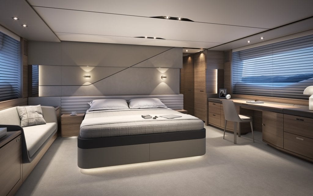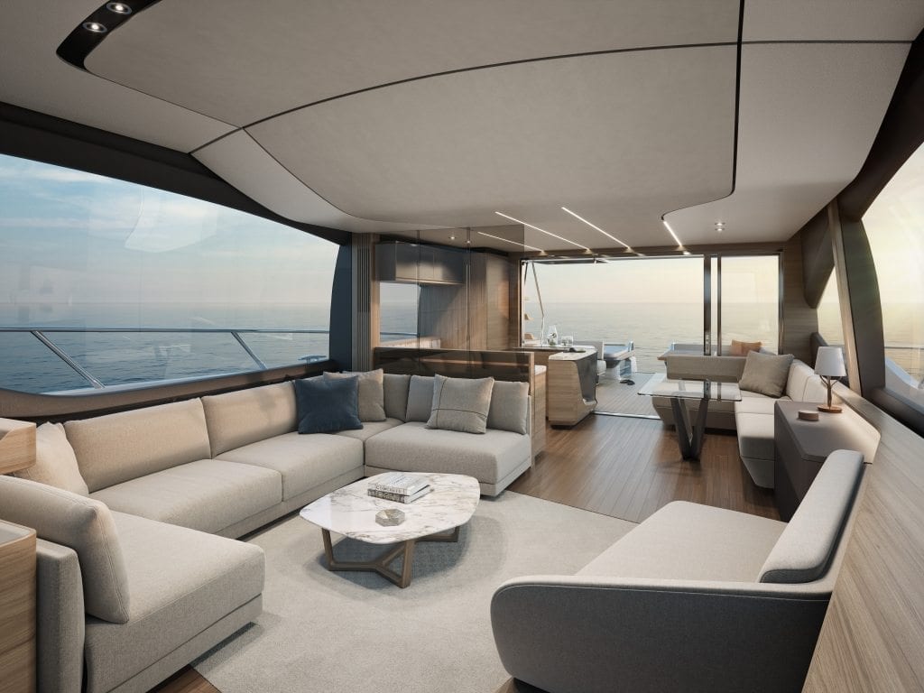 Inside, her cavernous main deck saloon uses dynamic lines and convivial seating, to seamlessly connect to the world outside through full length side windows. The informal arrangement invites you to take a seat, relax and enjoy the world class audio visual systems, designed and engineered in partnership with NAIM.