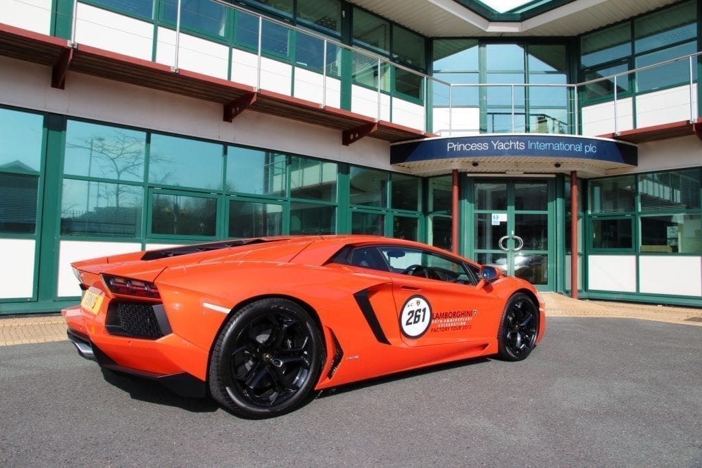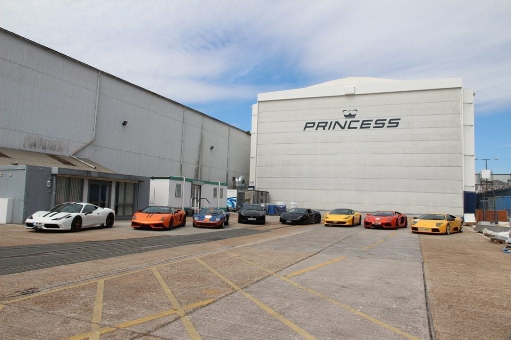 A total of 8 super cars ranging from the Ferrari 458, Jaguar F-Type, Lamborghini Gallardo GT40, to the magnificent Lamborghini Aventador made a spectacular entrance at the Newport Street factory site of Princess Yachts International plc.
