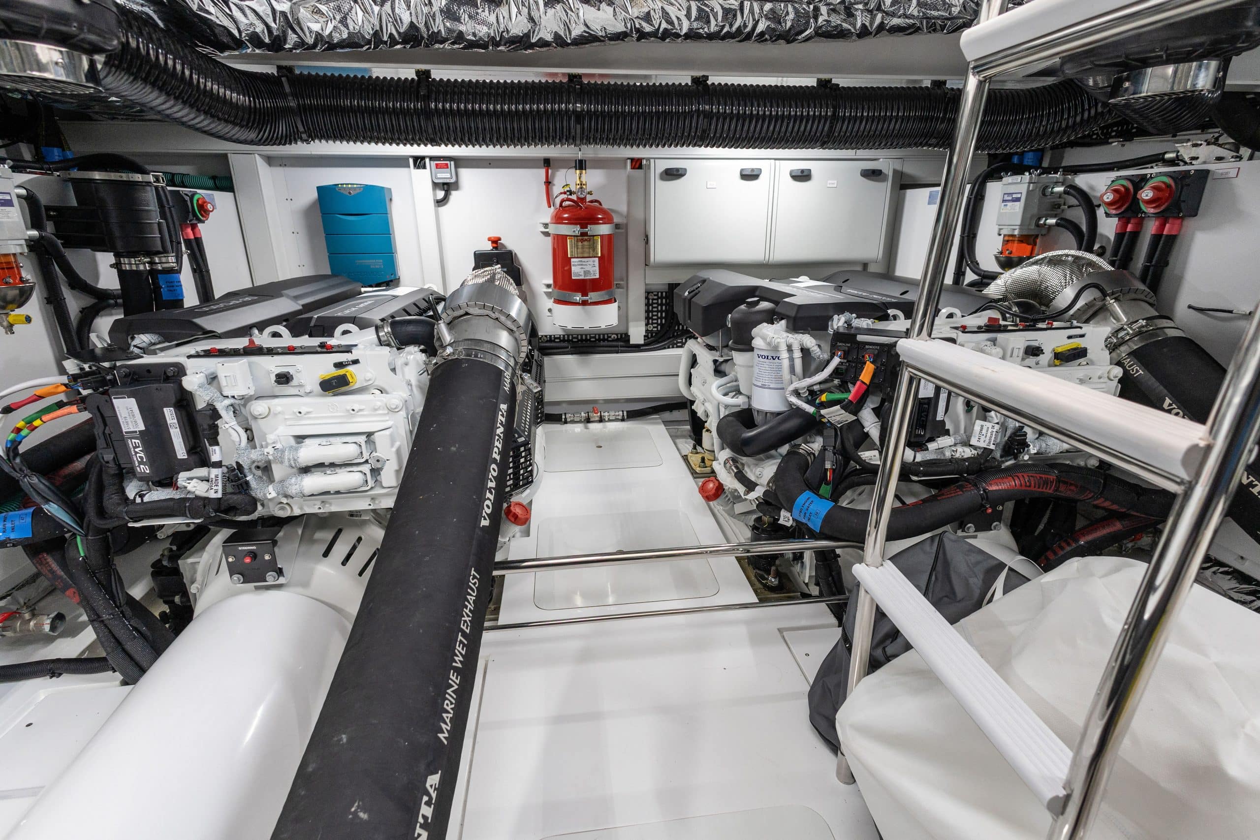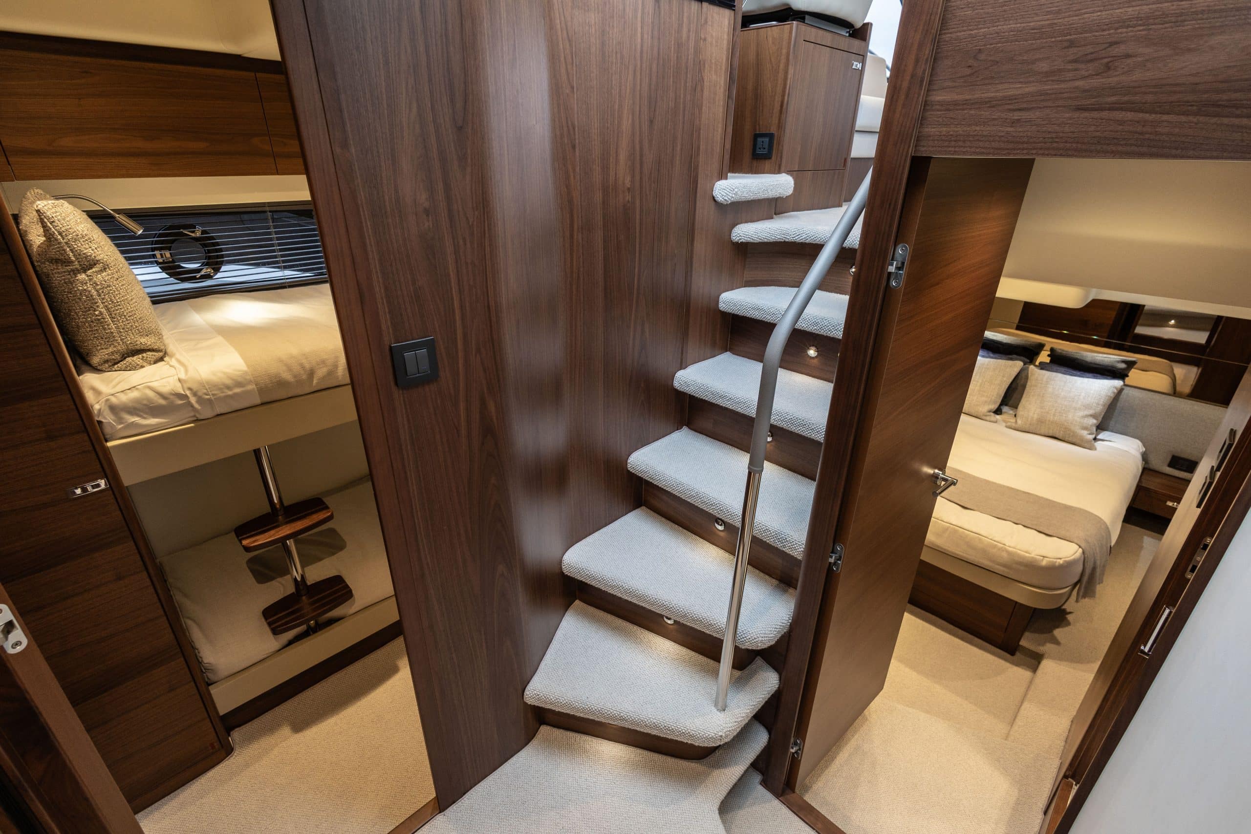 Twin Volvo IPS 800 (2 x 600 mhp) Engines • Bowthruster (120Kgf) with dual station controls • Volvo Automatic Interceptor trim tabs • Onan 11Kw generator • Walnut interior wood, satin finish • Deck saloon table with conversion to double berth • Electro-hydraulic transom platform • Scissor berths in forward cabin • Flybridge wetbar with sink, electric griddle/ BBQ and storage • Premium upholstery throughout • Stainless steel Lewmar Epsilon anchor • Dishwasher • Combination washer/dryer • Full height fridge/freezer (270ltr) • Premium audio system with LED TV’s in saloon and accommodation • Onboard Wifi • Garmin GMR 24 xHD3 colour radar with 24″, 4Kw Radome • Reverse cycle air-conditioning/heating