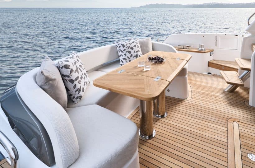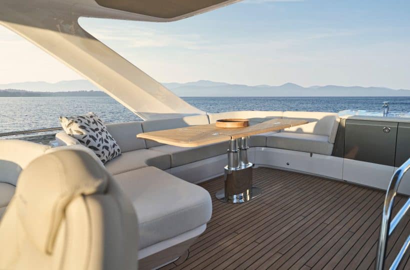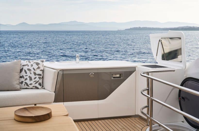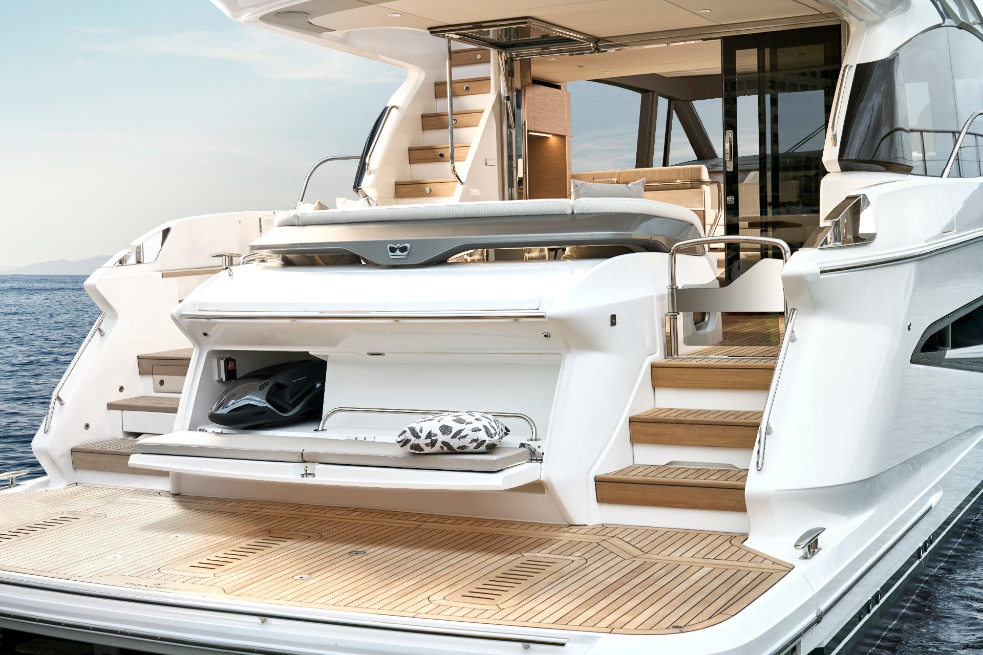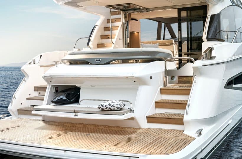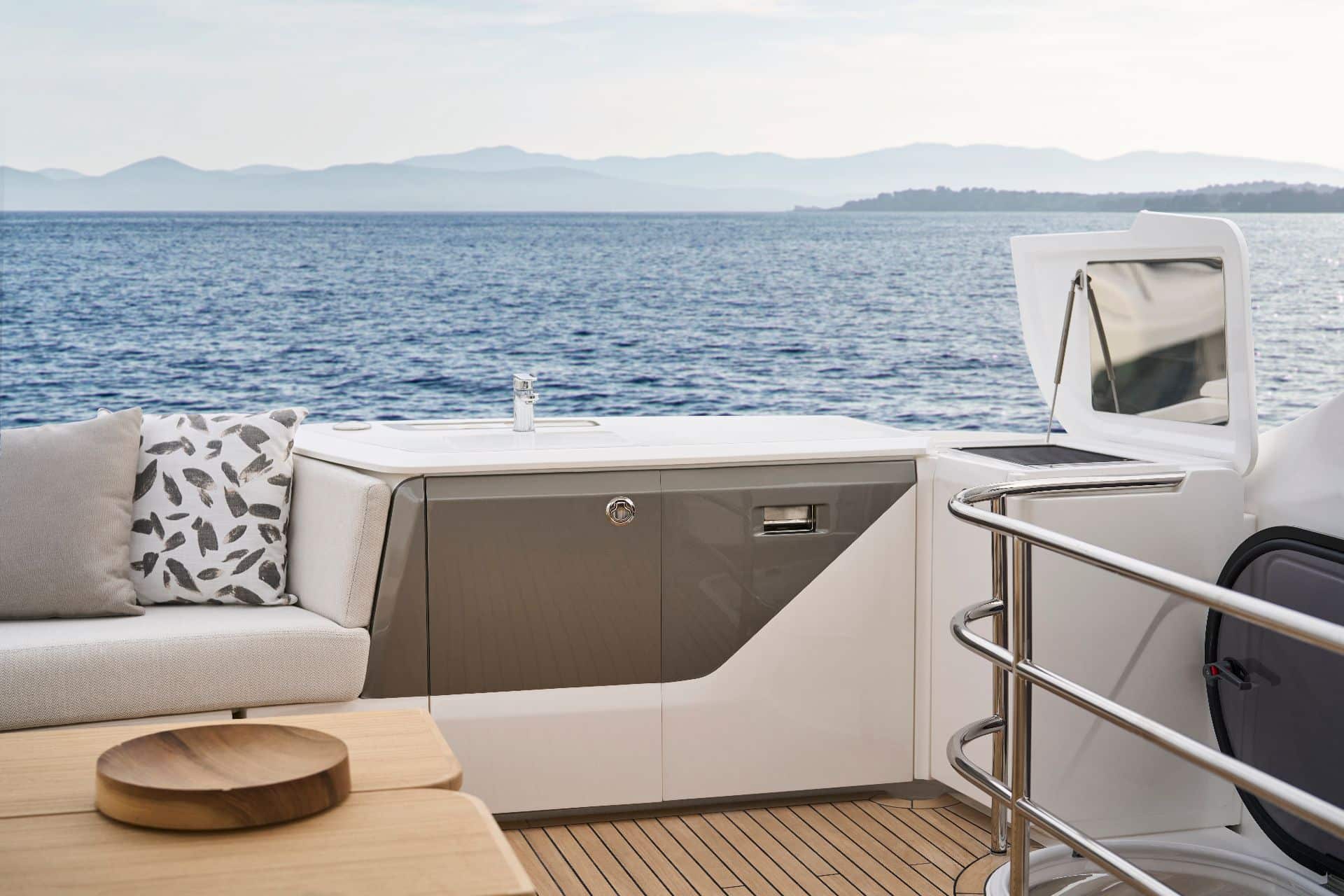The deck space extends far beyond the flybridge, as the foredeck offers an expansive terrace, a design feature inspired by larger Princess models. Twin sunpads can be enjoyed here, with the option for a coolbox and adjustable headrests that turn the pads into aft facing seating. In the cockpit is a seamless space that blends into the saloon and galley, and back down to the bathing platform, complete with mini “beach club” transom, with space for you to store water toys or enjoy a barbecue, thanks to the sink and fold down seat.