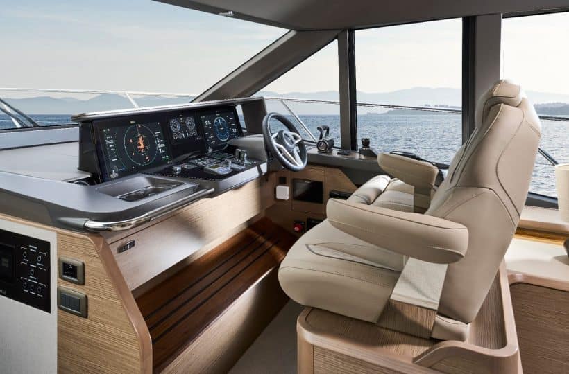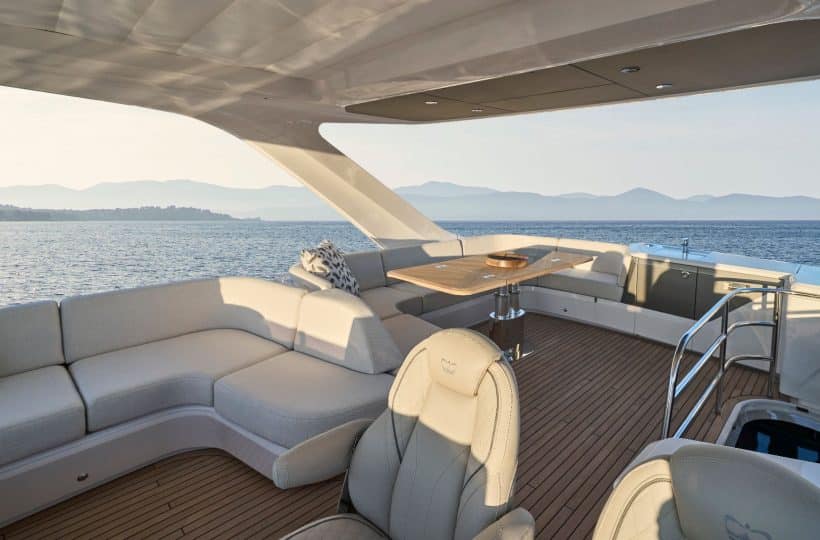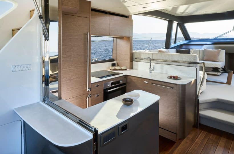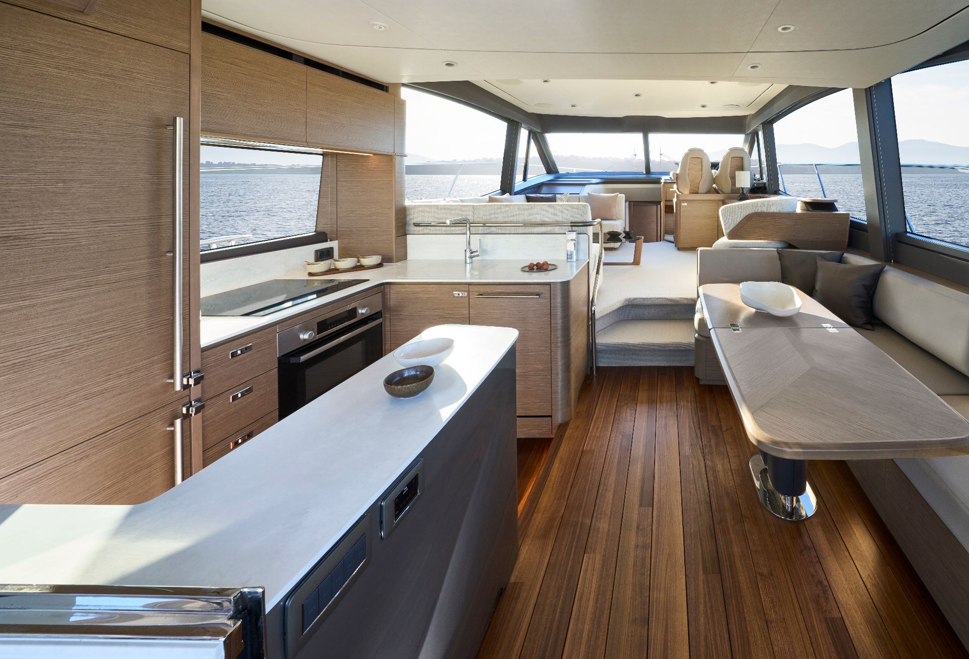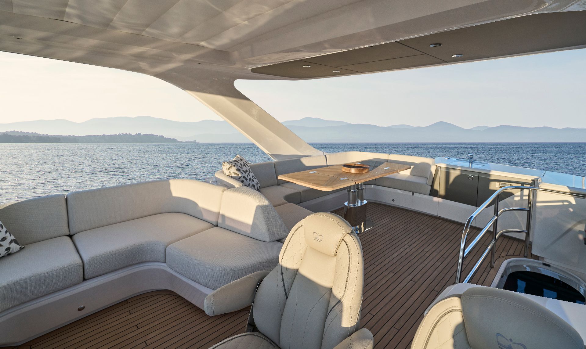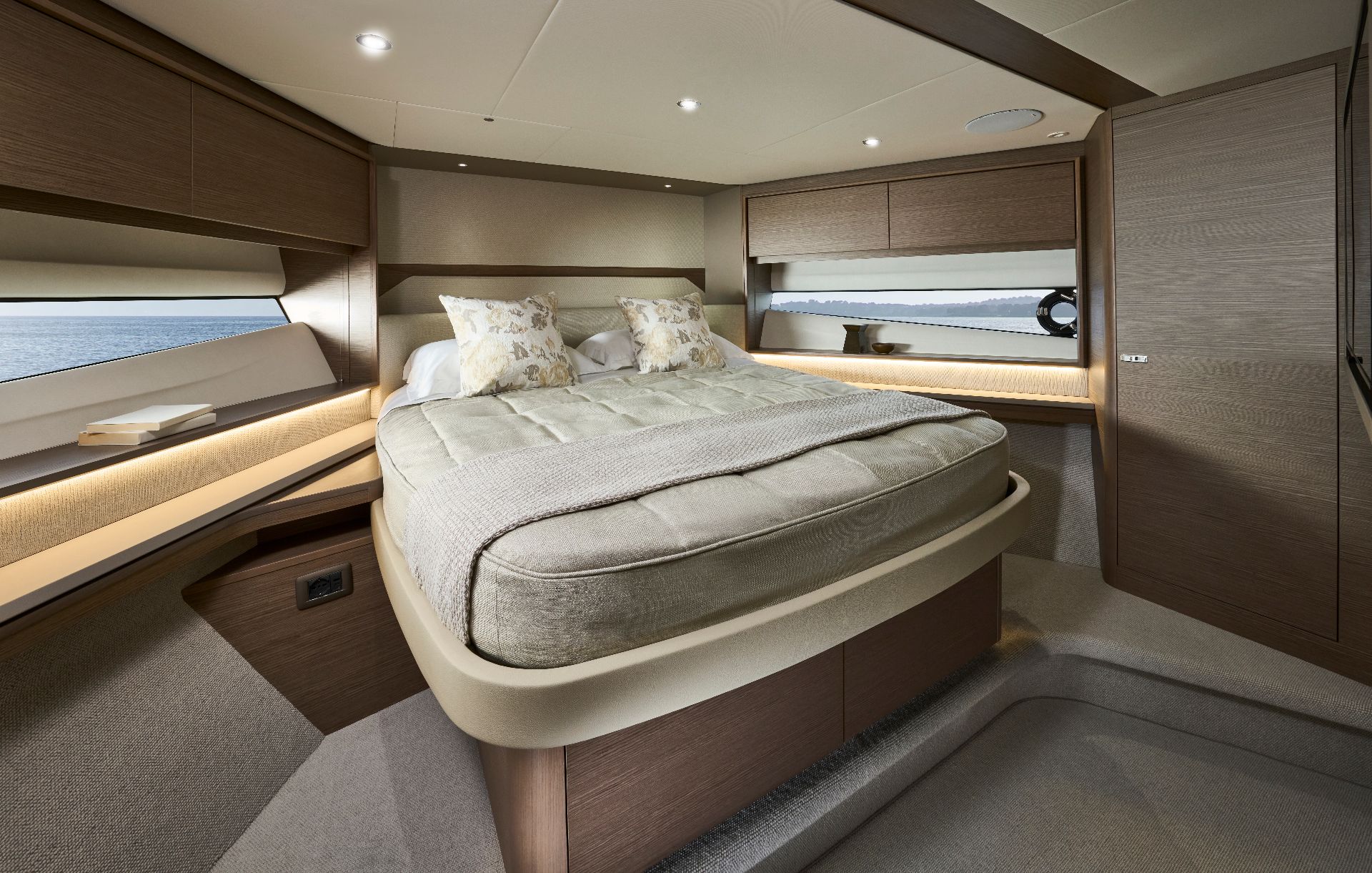 The deck space extends far beyond the flybridge, as the foredeck offers an expansive terrace, a design feature inspired by larger Princess models. Twin sunpads can be enjoyed here, with the option for a coolbox and adjustable headrests that turn the pads into aft facing seating. In the cockpit is a seamless space that blends into the saloon and galley, and back down to the bathing platform, complete with mini “beach club” transom, with space for you to store water toys or enjoy a barbecue, thanks to the sink and fold down seat.
