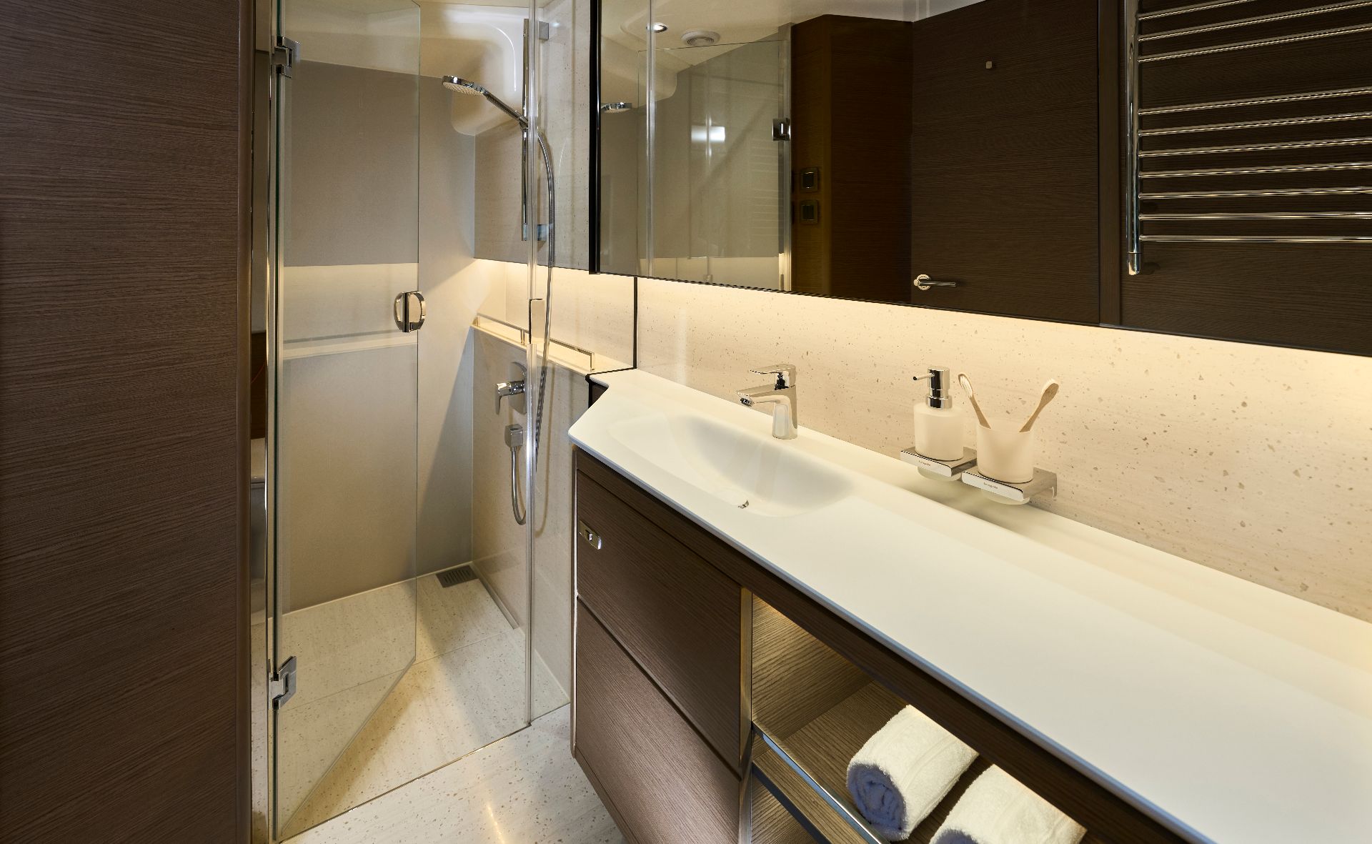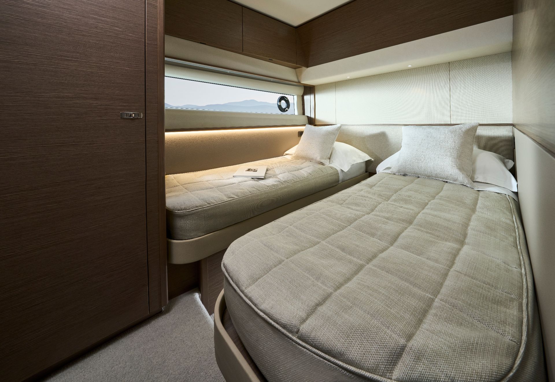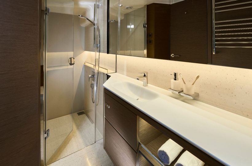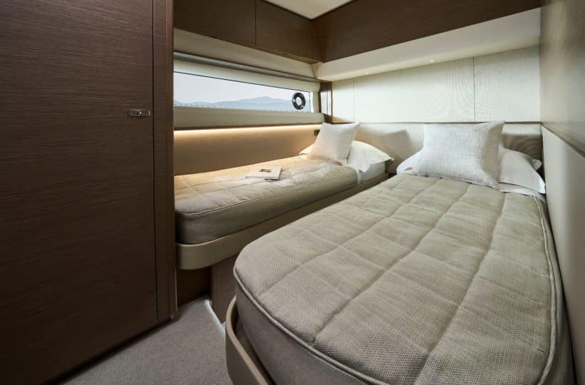 Inside is a paradise on the water, with a bright saloon fitted with panoramic windows, U-shaped sofa, a convertible coffee and dining table, and dining space that make this the ideal space to relax indoors. As you would expect, the lower deck is fitted with three inviting cabins; the forward VIP guest cabin, starboard twin cabin and the full beam owner’s stateroom, which embodies opulence with its breakfast area, ensuite bathroom in ‘superyacht’ style and even a walk-in wardrobe. For those looking for crew on board, an option for a single aft crew cabin with ensuite and storage is available.