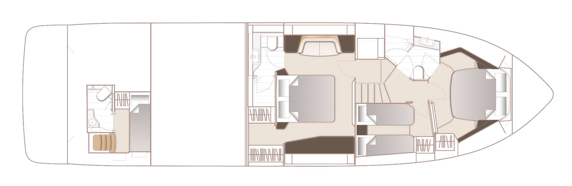 The extensive flybridge of the Princess F58 focusses on socialisation and leisure, with a large dining area, wet-bar, electric barbecue, and beautifully curved seating for guests to enjoy each other’s company. Starboard seating easily converts into a sunpad, and for those at the helm, you’ll have full view of your surroundings, to ensure you don’t miss anything on-deck, or on the horizon.