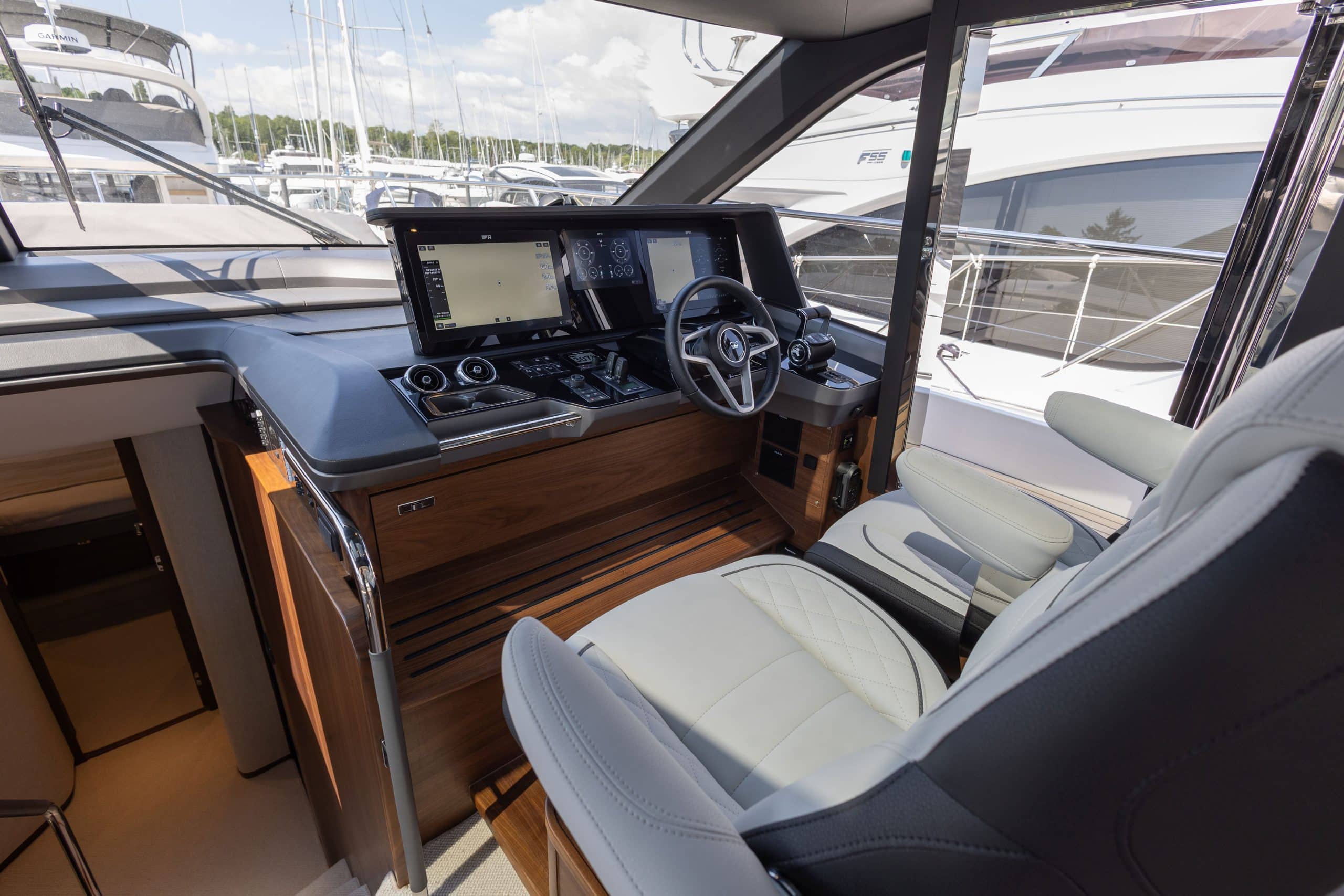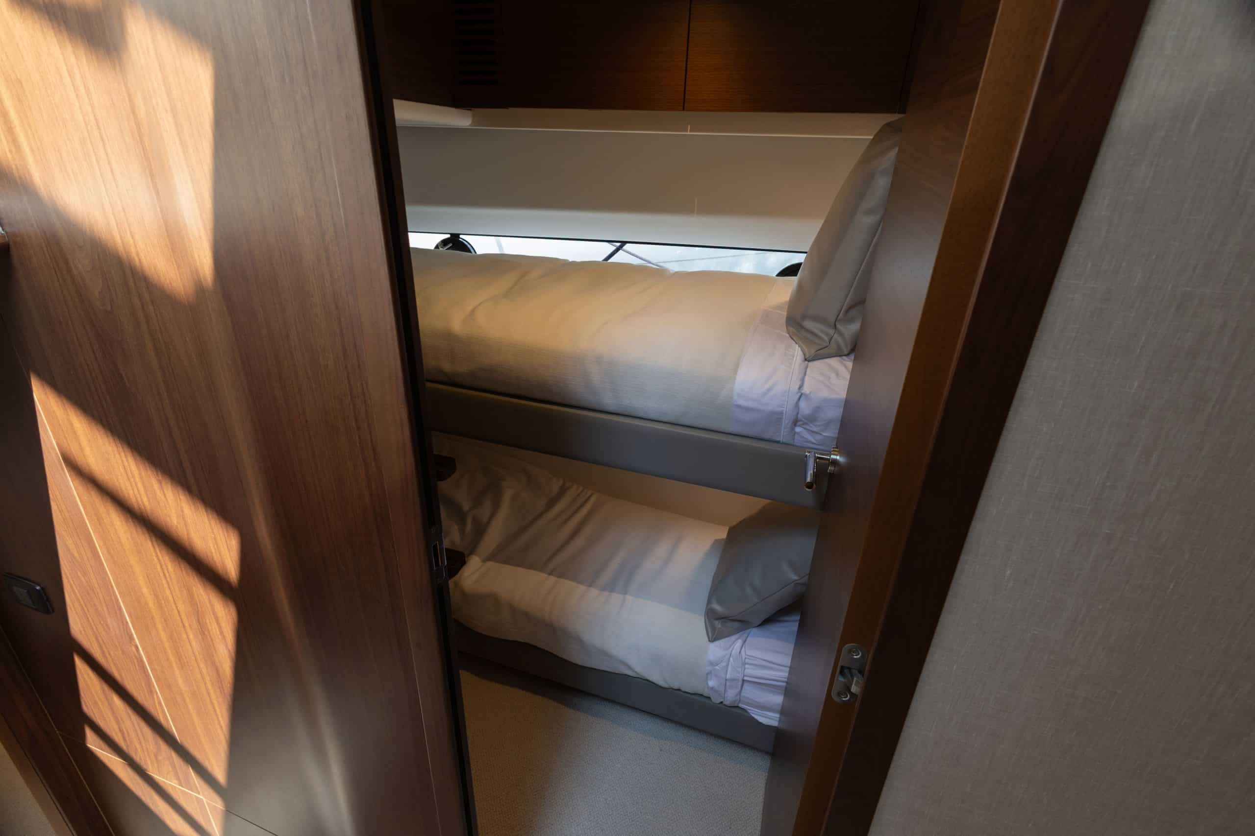 Twin MAN V12-1400 engines (2 x 1400mhp) • White gelcoat finish • Walnut interior wood, satin finish • Gyro stabilisation (Seakeeper 18) • Variable speed bow and stern thrusters with hold-function docking facility • Electrically operated sun awning to aft end of cockpit • Electro-hydraulic telescopic passerelle • Teak laid decking • Dual Raymarine Axiom 2 XL 16″ multifunction navigation displays at both helms • Electric sliding roof over saloon • Onan 19kW generator • Premium Fusion MS-RA670 audio packages with Focal speakers • Exterior upholstery in Comfort Exterior Met Ice with Met Storm contrast accents • Reverse cycle air-conditioning/heating • Seabob storage