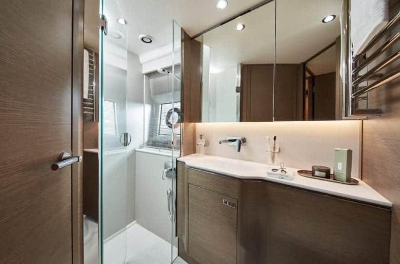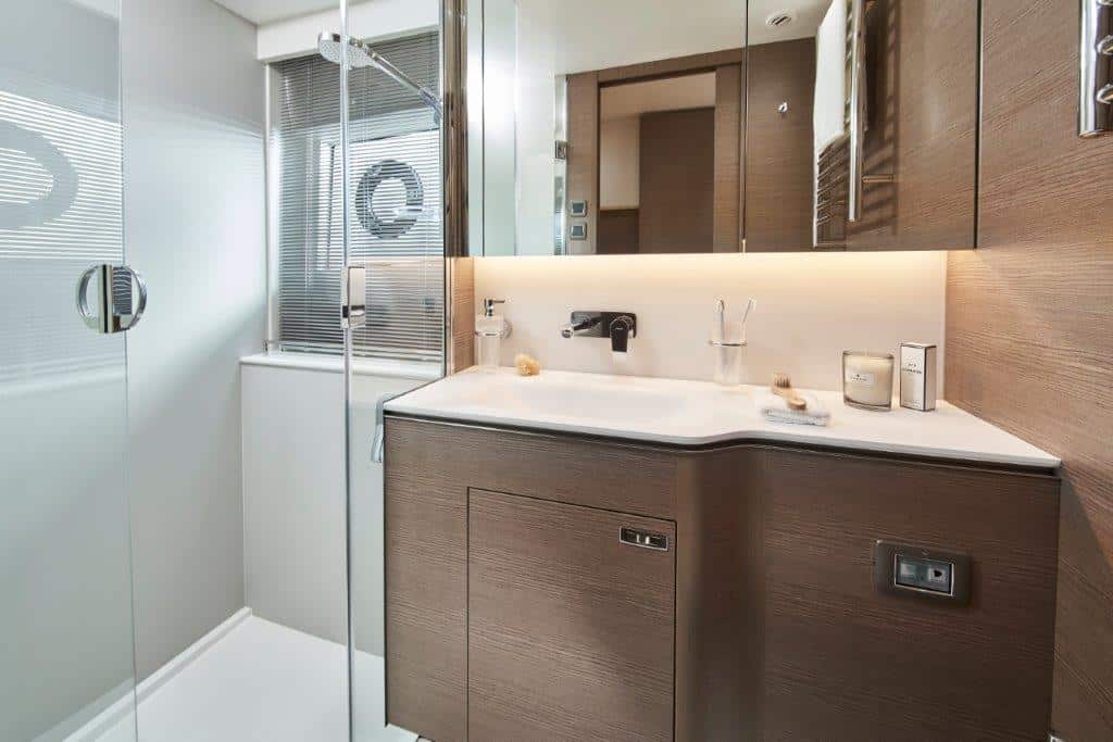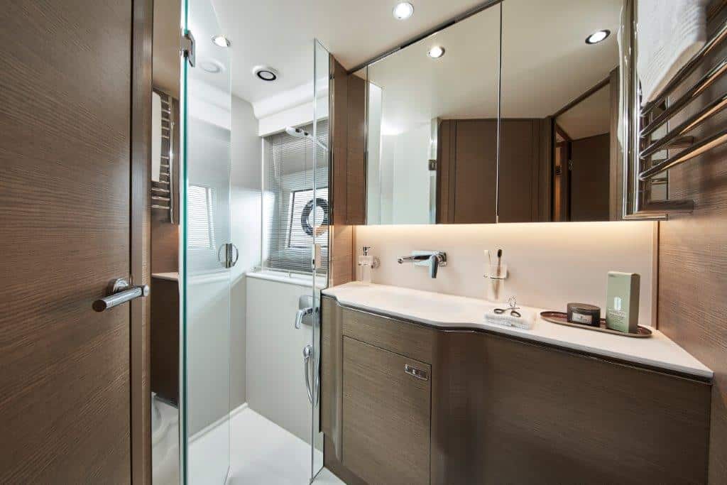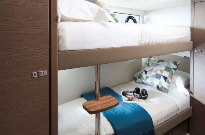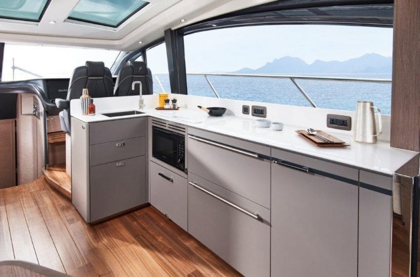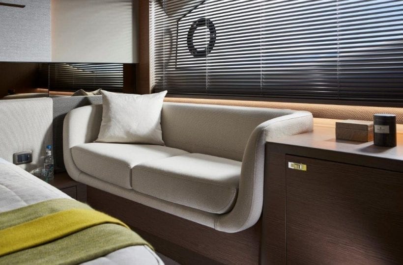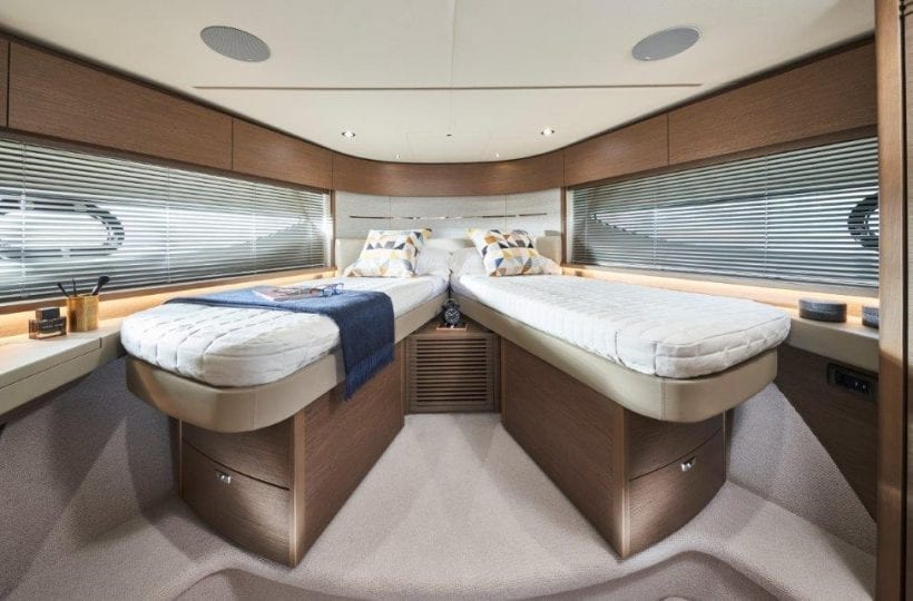 Below deck, there is spacious accommodation for up to six guests across three beautifully appointed cabins, including an impressive full-beam master stateroom with a large double bed – thanks to the space created within the resin-infused deep-V hull of this craft.