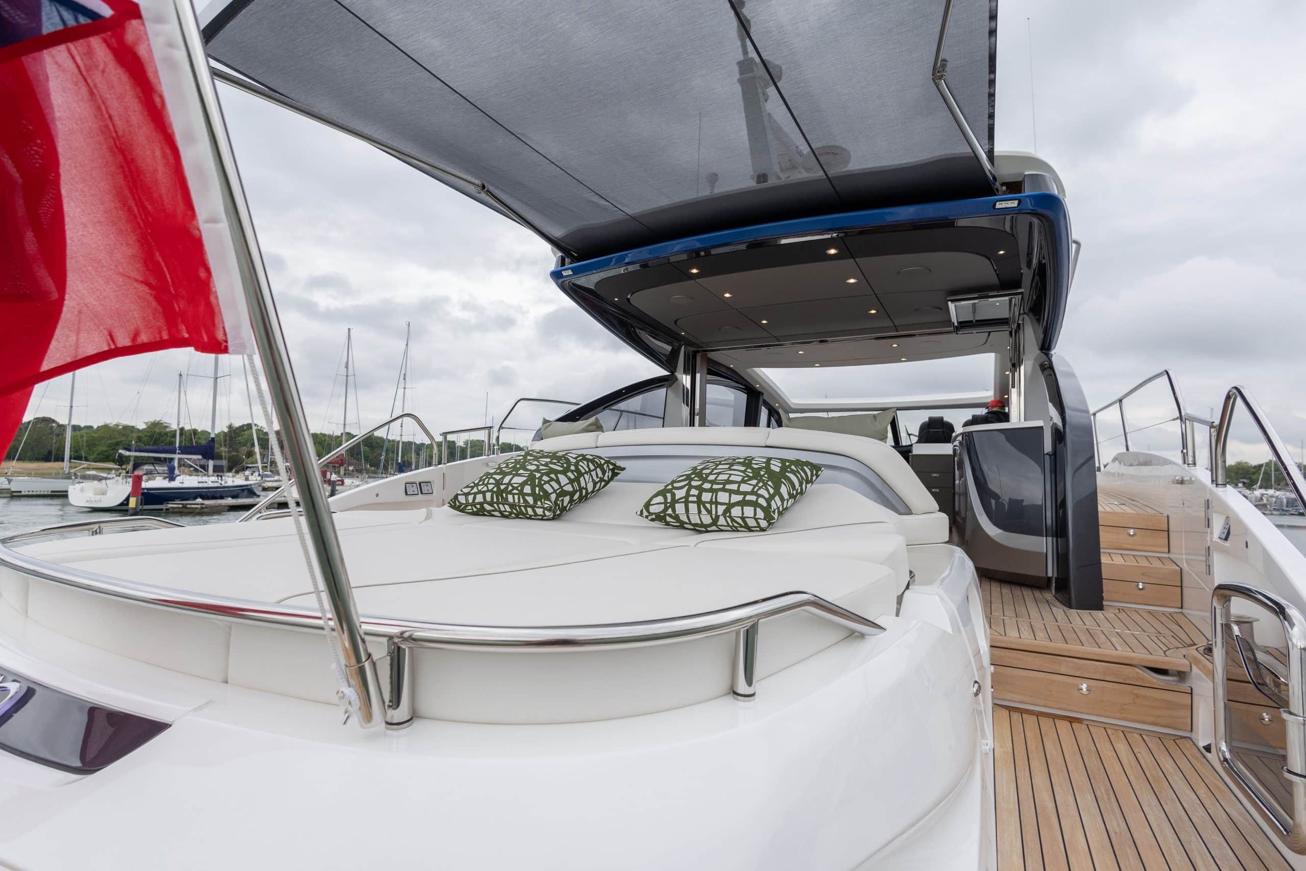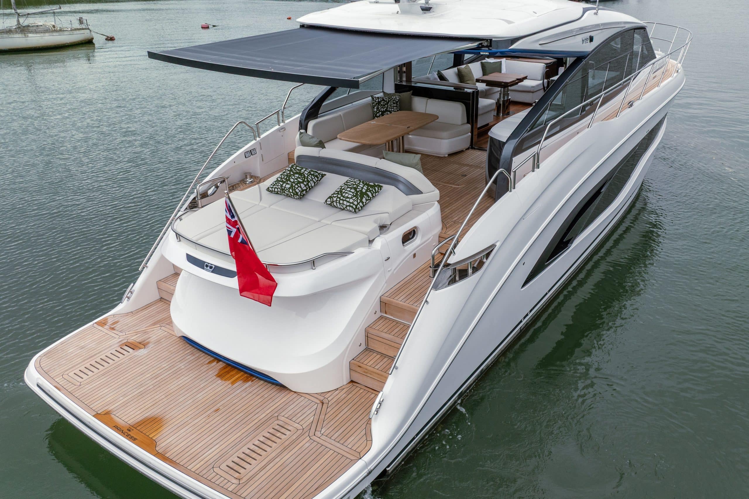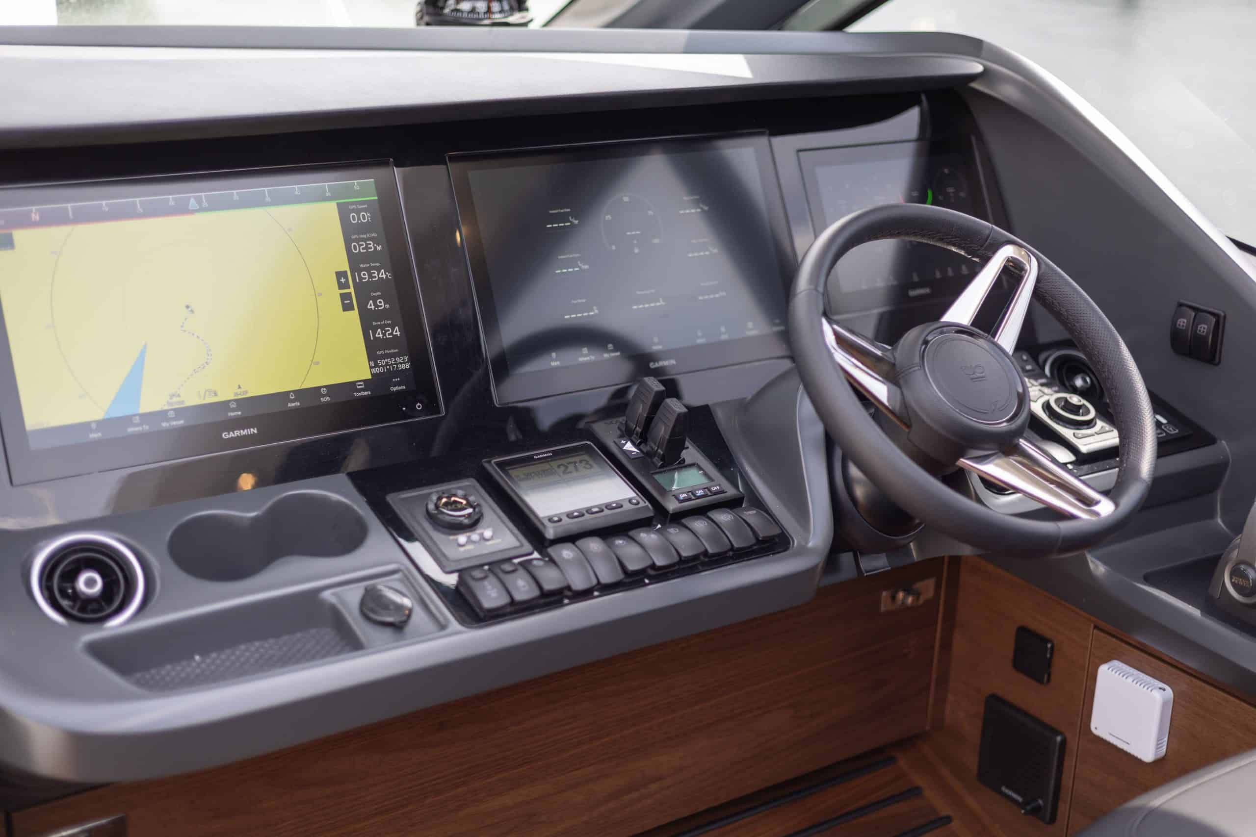 Twin Volvo D13-1000 (2 x 1000hp) diesel engines • Volvo joystick control • White gelcoat hull • Walnut interior wood, satin finish • Three cabins accommodating six guests • Teak laid decks • Seakeeper 9 gyro stabilisation • Variable speed bow and stern thrusters • Saloon dining/coffee table with twin electrically operated leg mechanisms • Concealed galley storage unit with electric lift • Aft cabin fitout • Onan 17.5kW generator • Garmin 434 XHD3 radar • Reverse cycle air-conditioning • Underwater lighting • Electrically operated sun awning to aft end of cockpit in grey • Electro-hydraulic telescopic passerelle • Icemaker • Combination washer/dryer • Premium audio package • Onboard Ethernet WiFi network