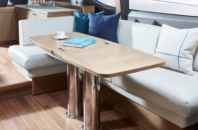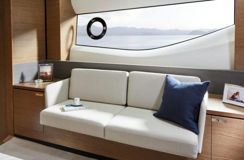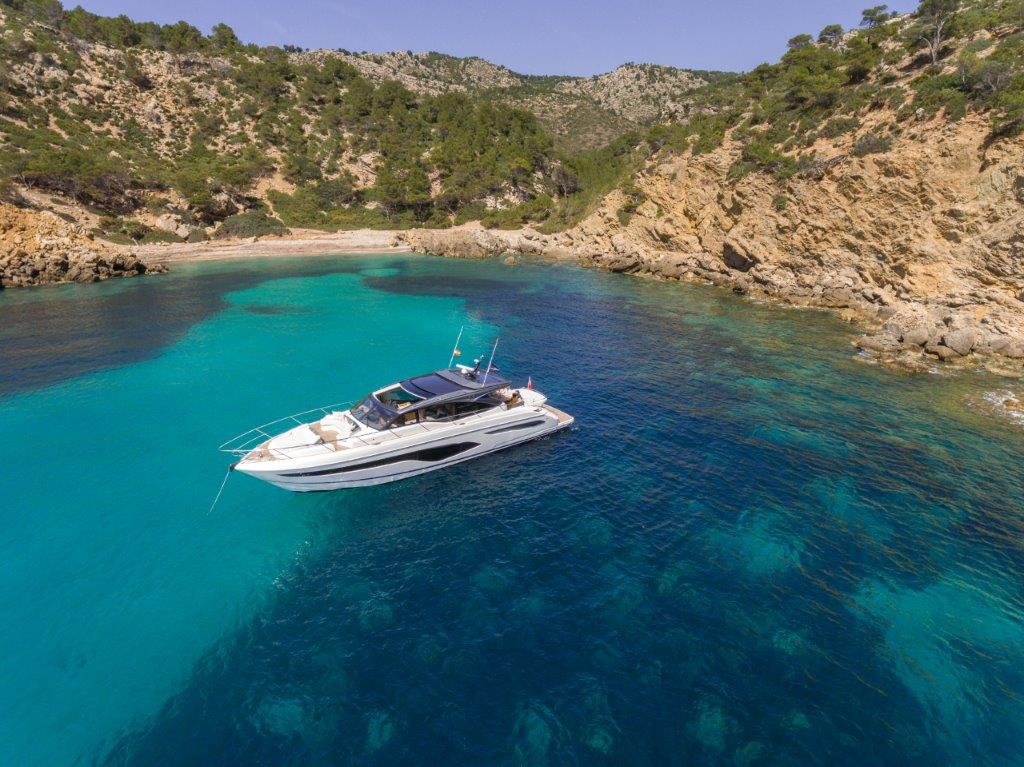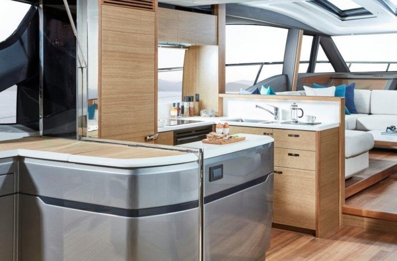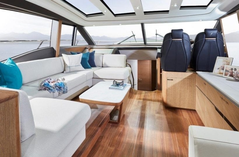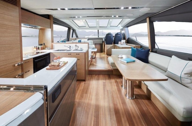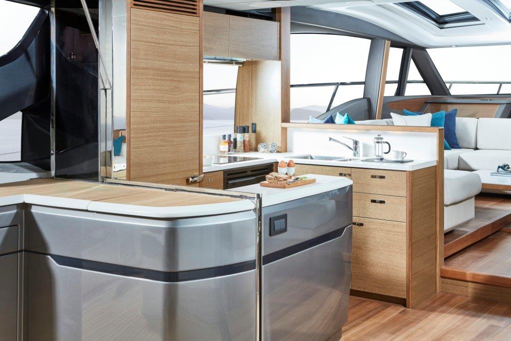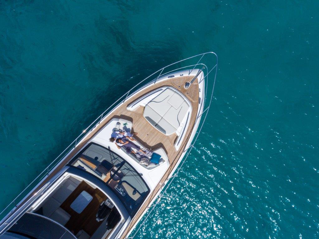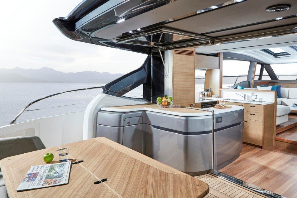Careful attention has been paid to the spaciously designed cockpit and fully equipped dining area, allowing you to enjoy time with family and friends. Offering aft and foredeck sunpads, you won’t be short on sunbathing space for those warmer days. Climate control, sliding doors and a retractable sunroof, provides you the flexibility to utilise the V65 in all weathers and on all occasions. A large transom allows you to enjoy watersports at ease, as its hydraulics lower you gently into the water.