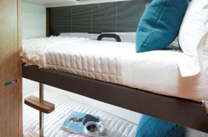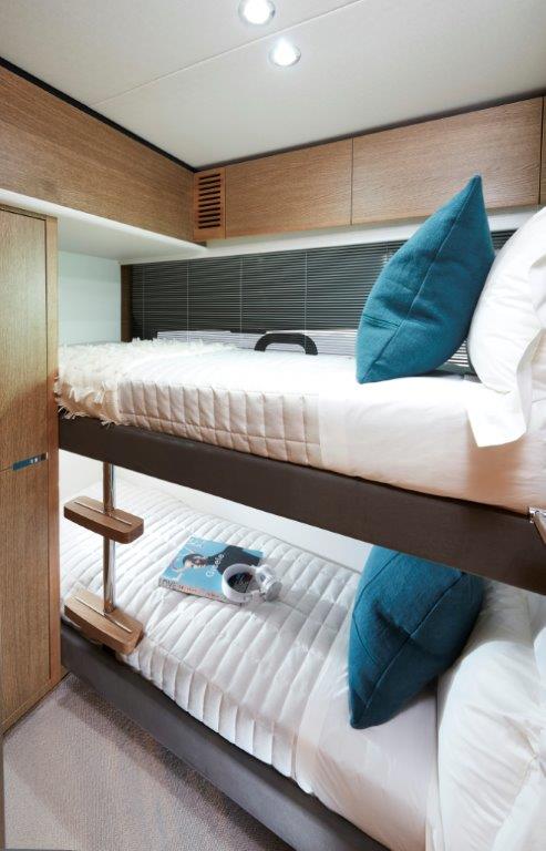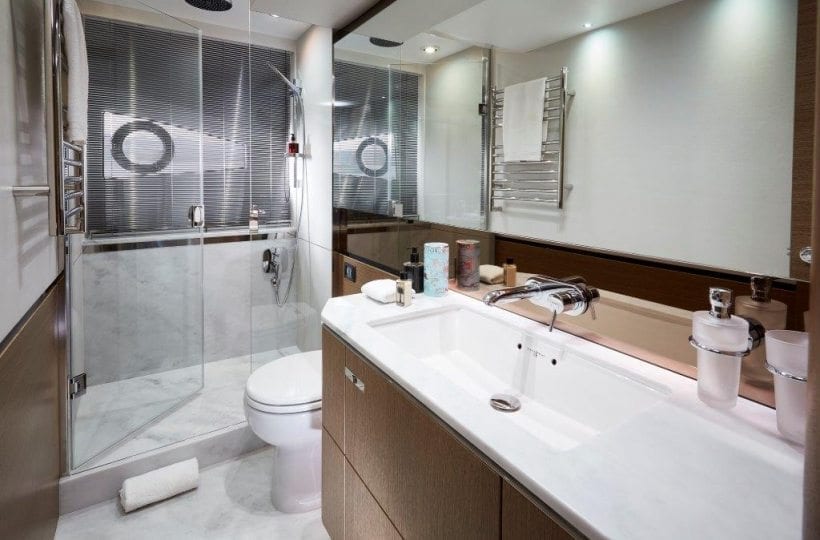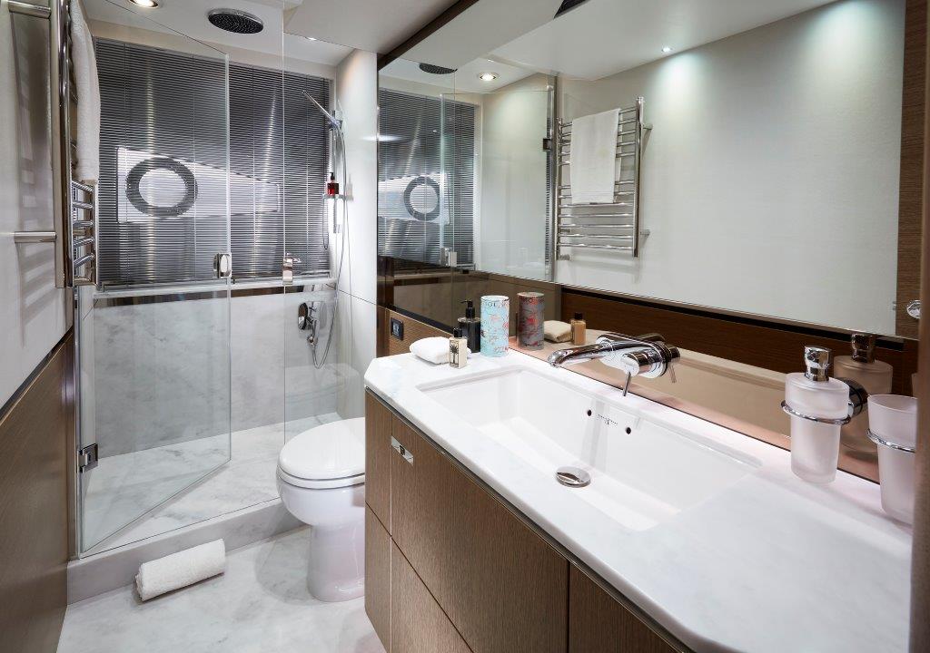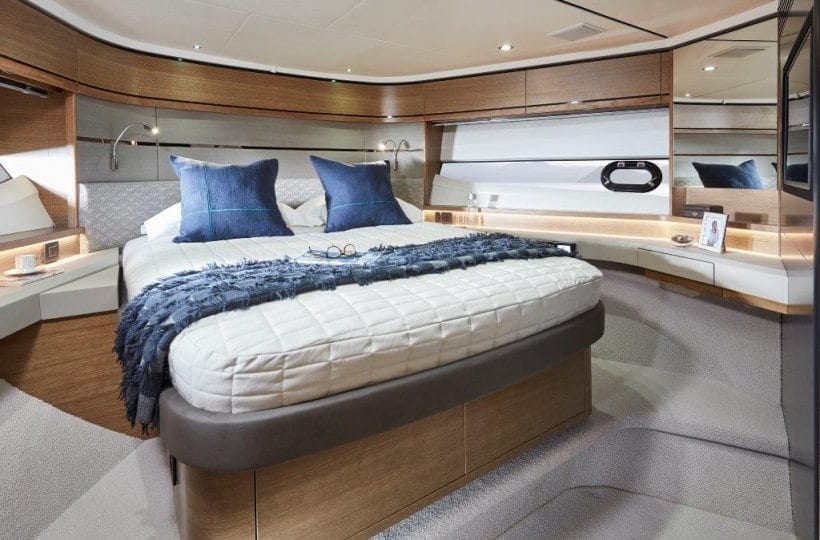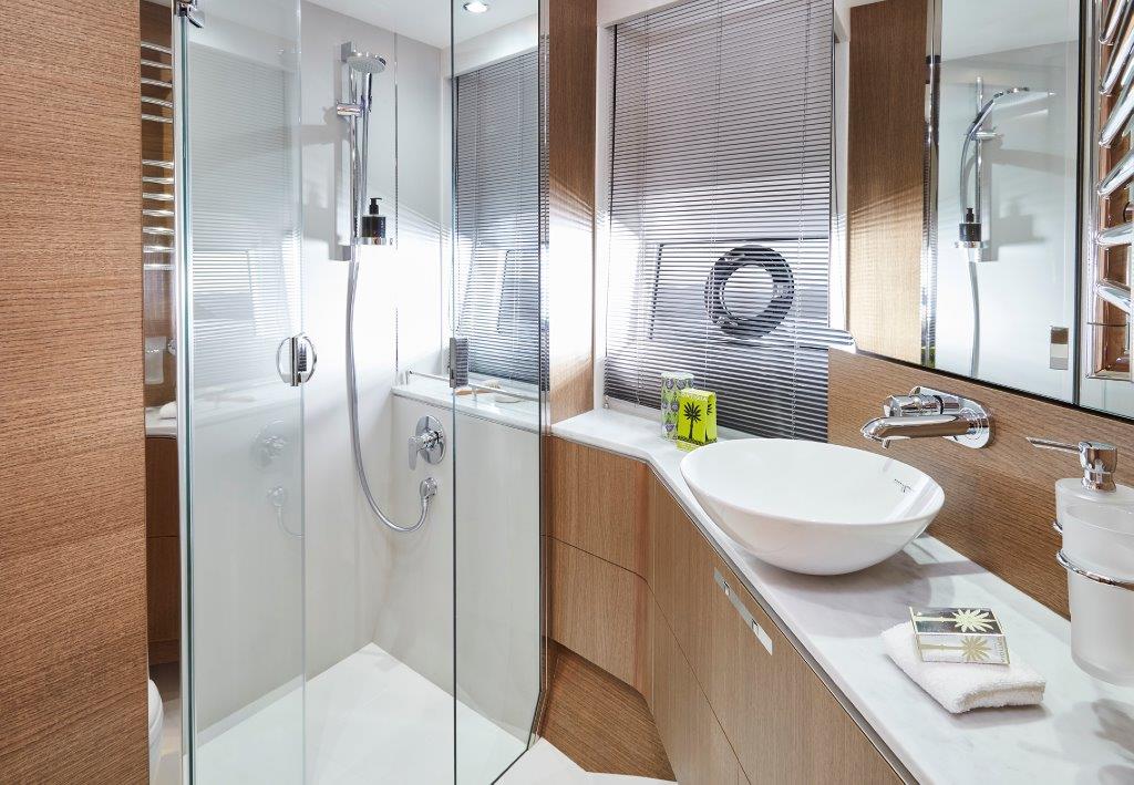Below deck, the Princess V65 is able to comfortably accommodate eight overnight guests, in four beautifully appointed cabins which feature panoramic windows in the Master and Forward cabins, courtesy of the elegant hull glazing. Thanks to her deep-V hull, Princess have been able to use every inch of space to create a full deck accommodation experience, creating a clear separation between daytime and evening relaxing. A spectacular feature is the full beam owners stateroom, with wrap-around glazing and a large ensuite. Aft, there is an option to have a single cabin berth for occasional guests or crew.
