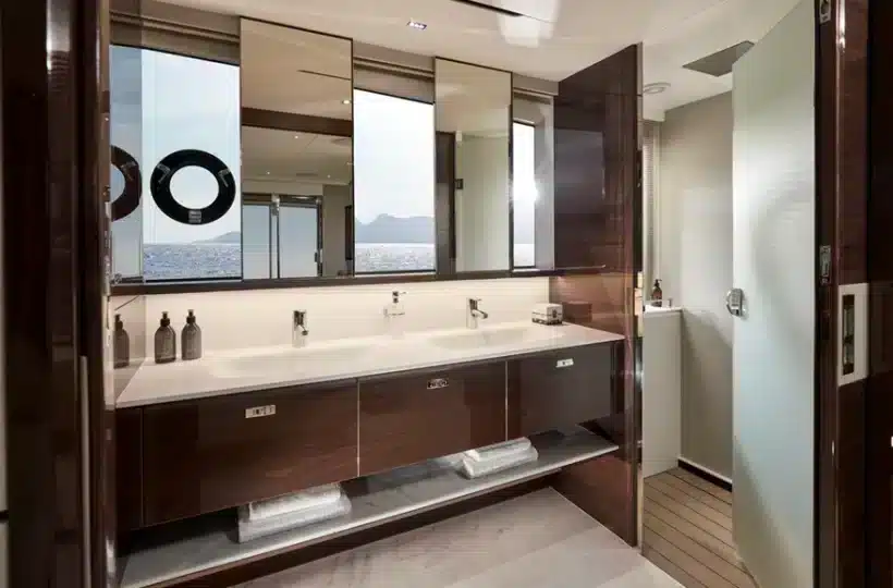 Her interior is just as captivating, with the outside welcomed in via the large windows which flow either side of the entire length of the main deck, encasing the saloon, galley and forward dining area. The use of natural and ambience lighting, innovative design and exquisite materials are combined here to create an idyllic space in which to while your time. Below deck, 8 guests are accommodated across 4 guest cabins, each with their own private en-suite. A full-beam master stateroom is located amidships, with the option to configure the main deck as above. Located aft of the main guest accommodation is the crew quarters which can accommodate 3 crew with the standard layout.