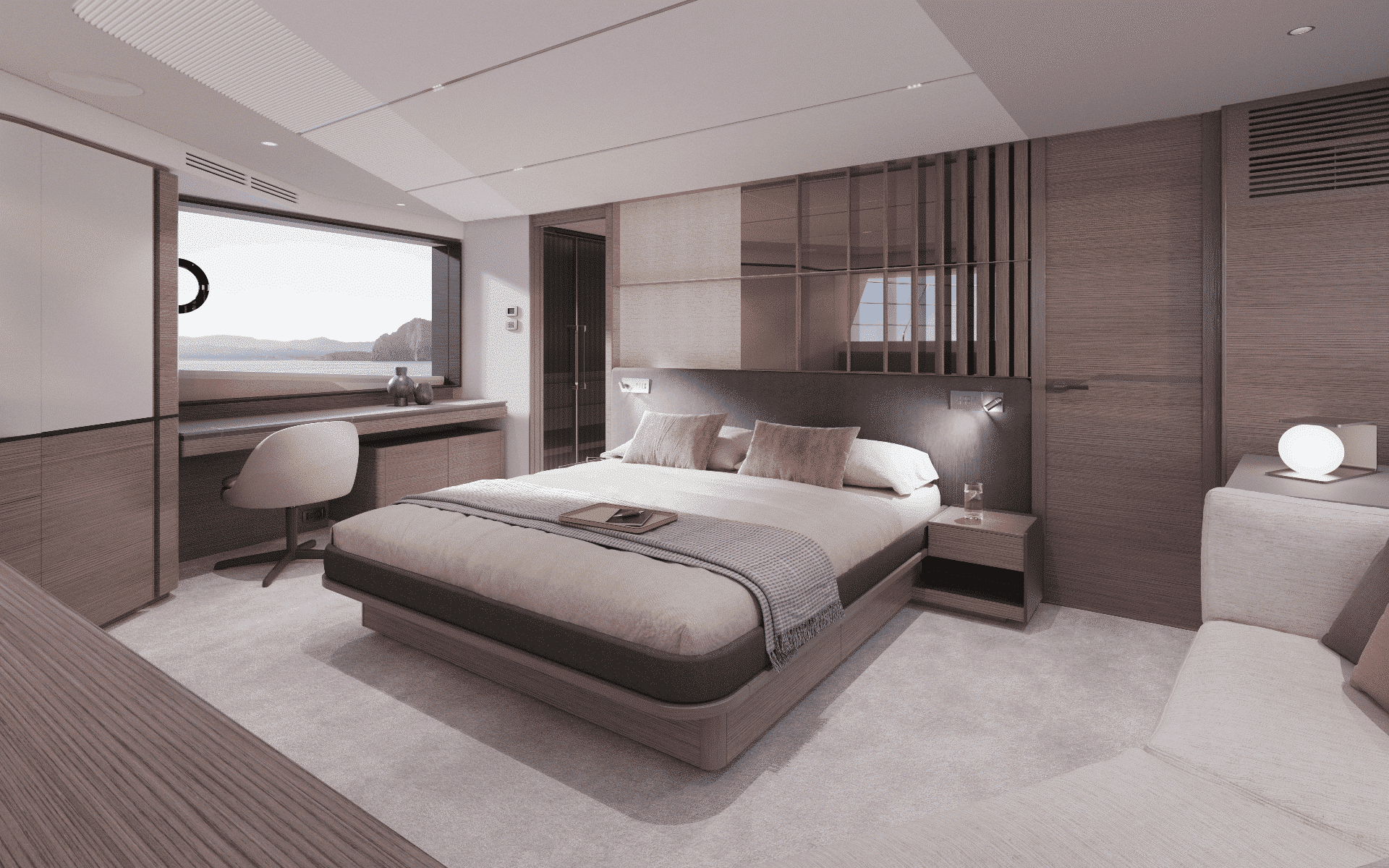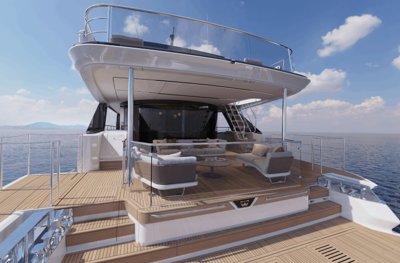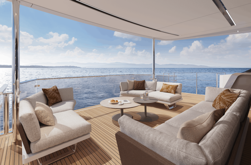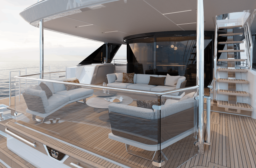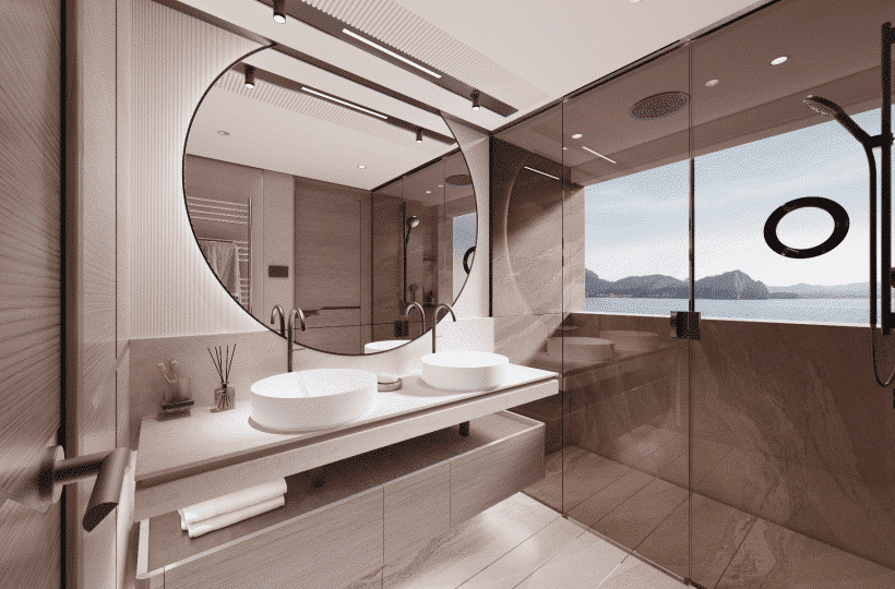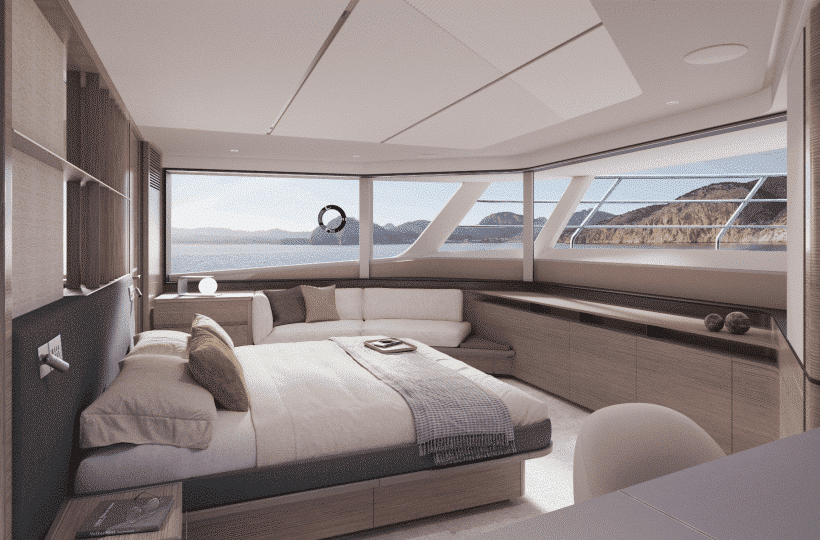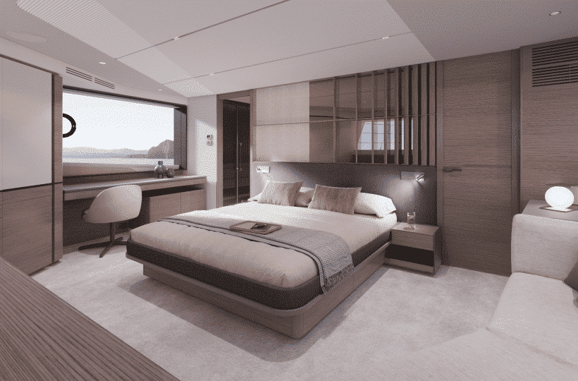 The owner’s suite positioned forward of the main deck, features 180o panoramic glazing that offers breathtaking views. For added exclusivity, an optional gullwing door provides direct access to the ‘Owner’s Foredeck Terrace,’ an ideal enclave for enjoying a peaceful morning coffee.