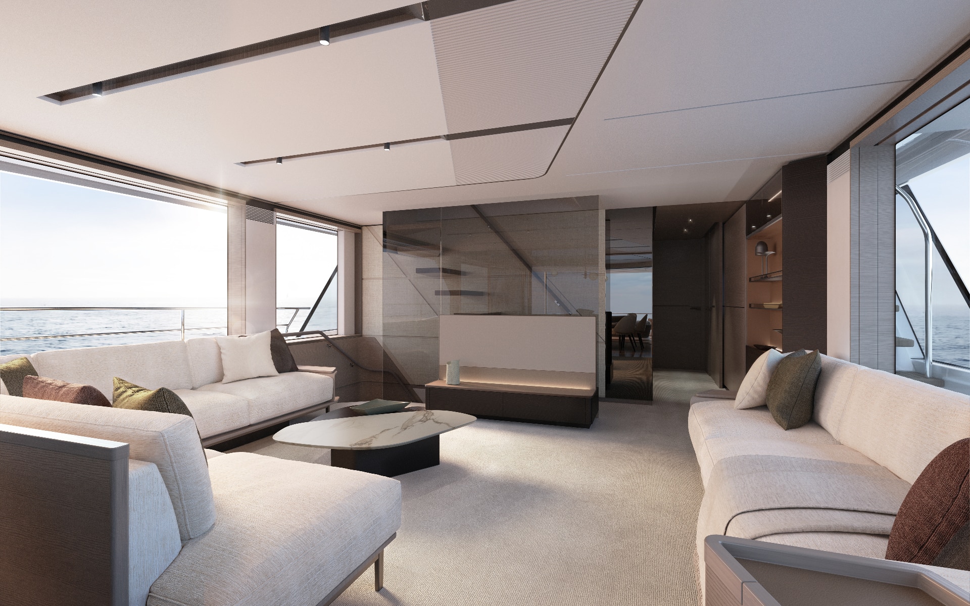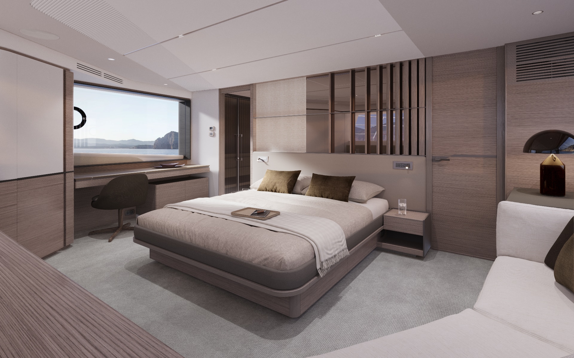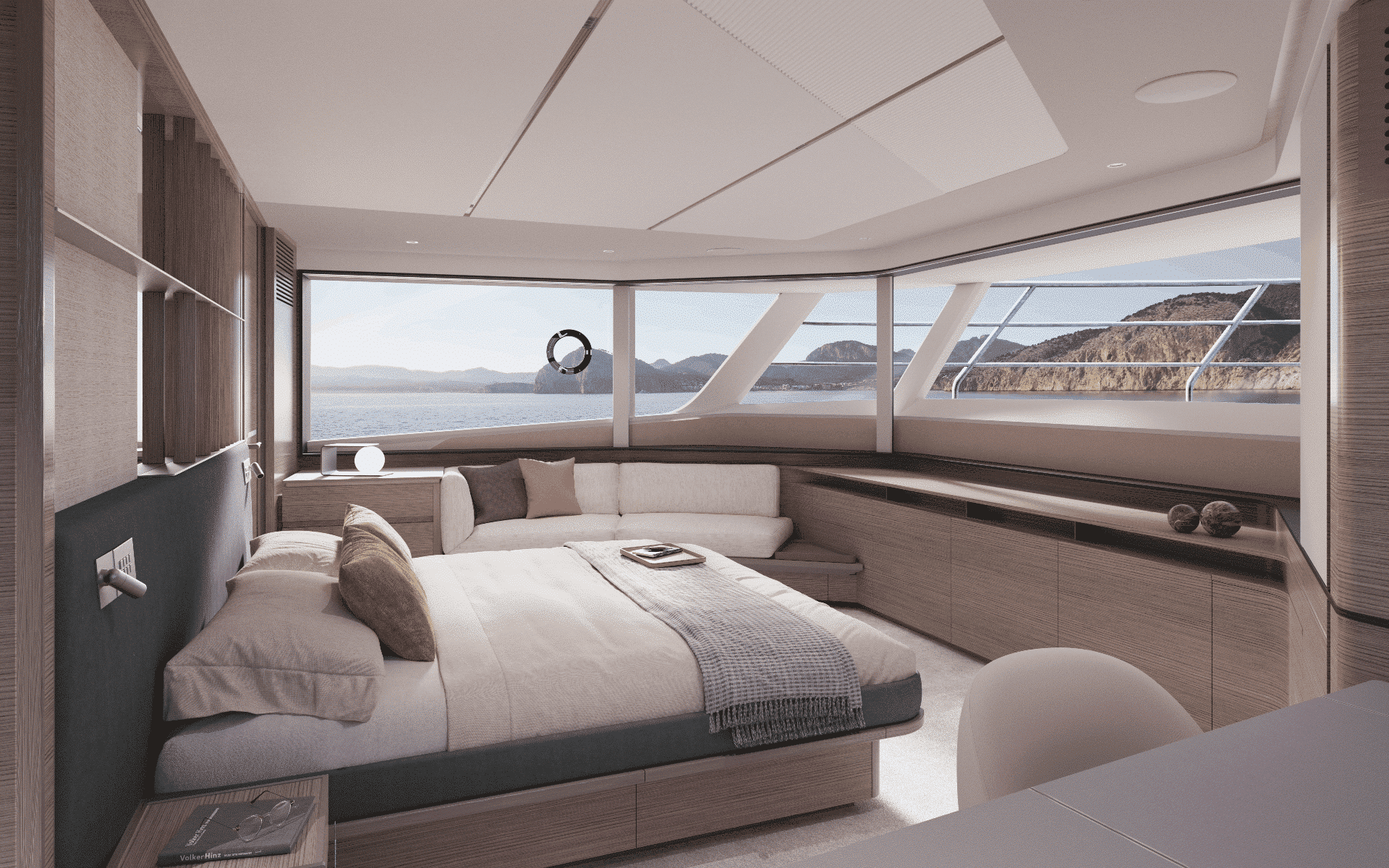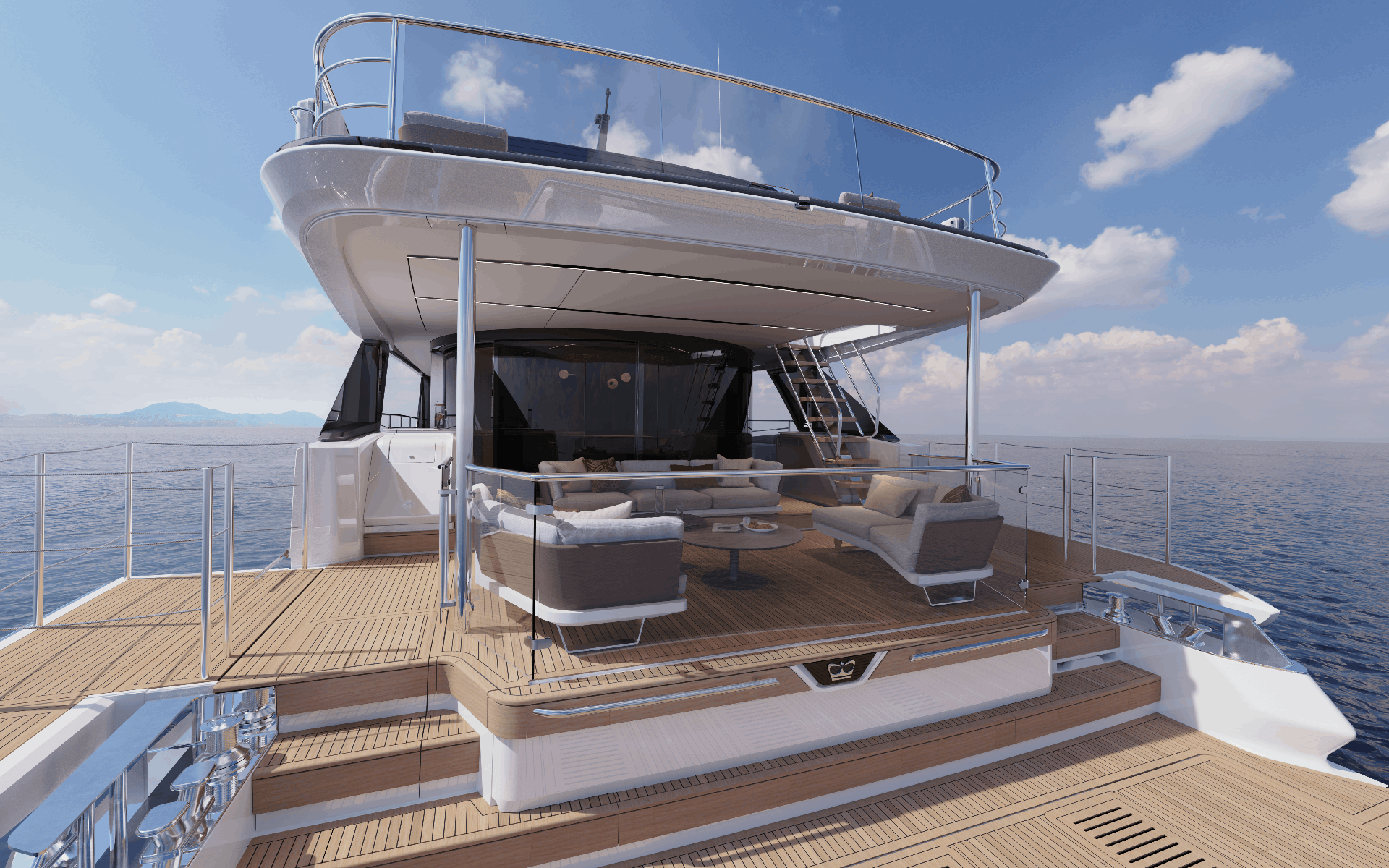 The owner’s suite positioned forward of the main deck, features 180o panoramic glazing that offers breathtaking views. For added exclusivity, an optional gullwing door provides direct access to the ‘Owner’s Foredeck Terrace,’ an ideal enclave for enjoying a peaceful morning coffee.