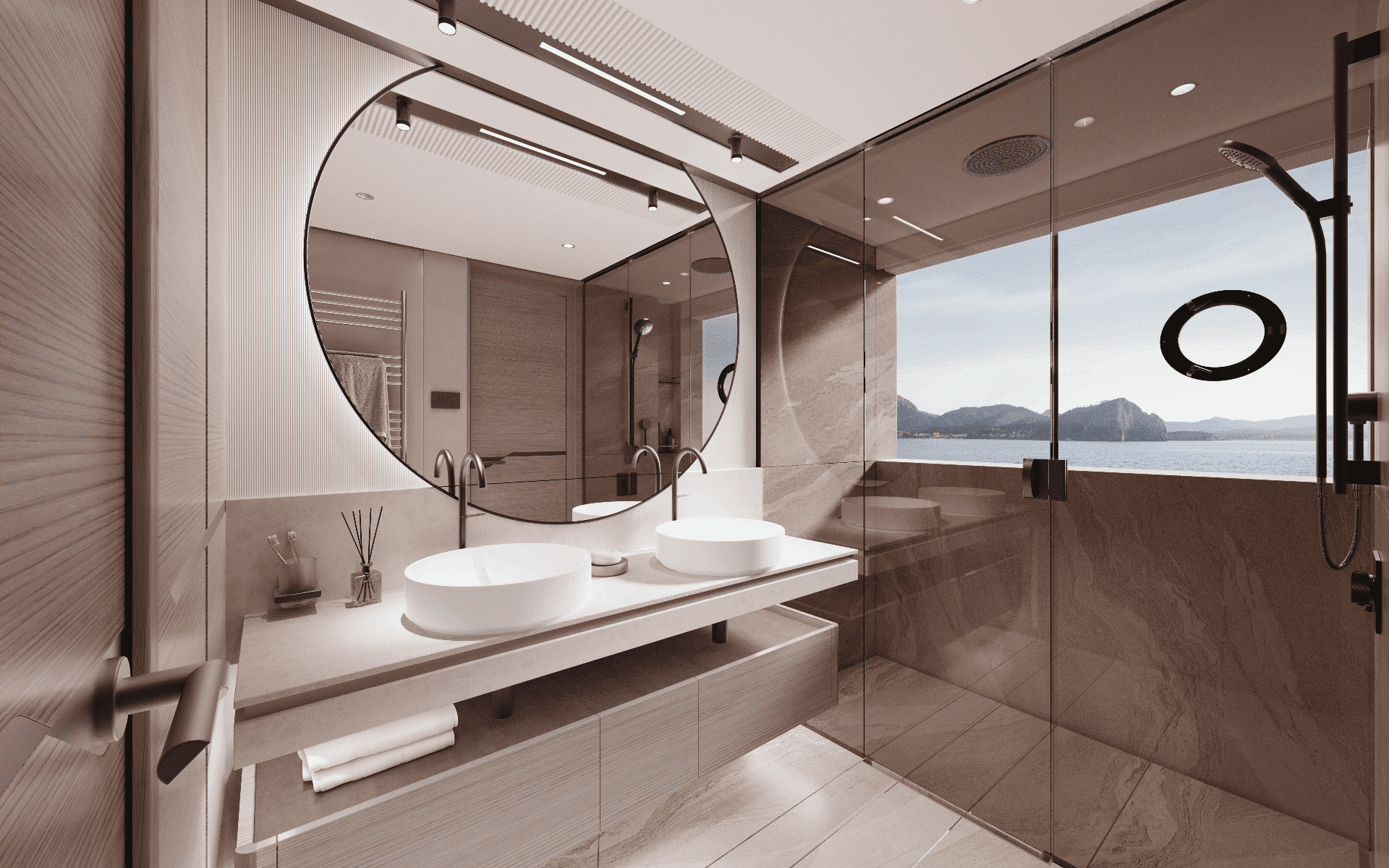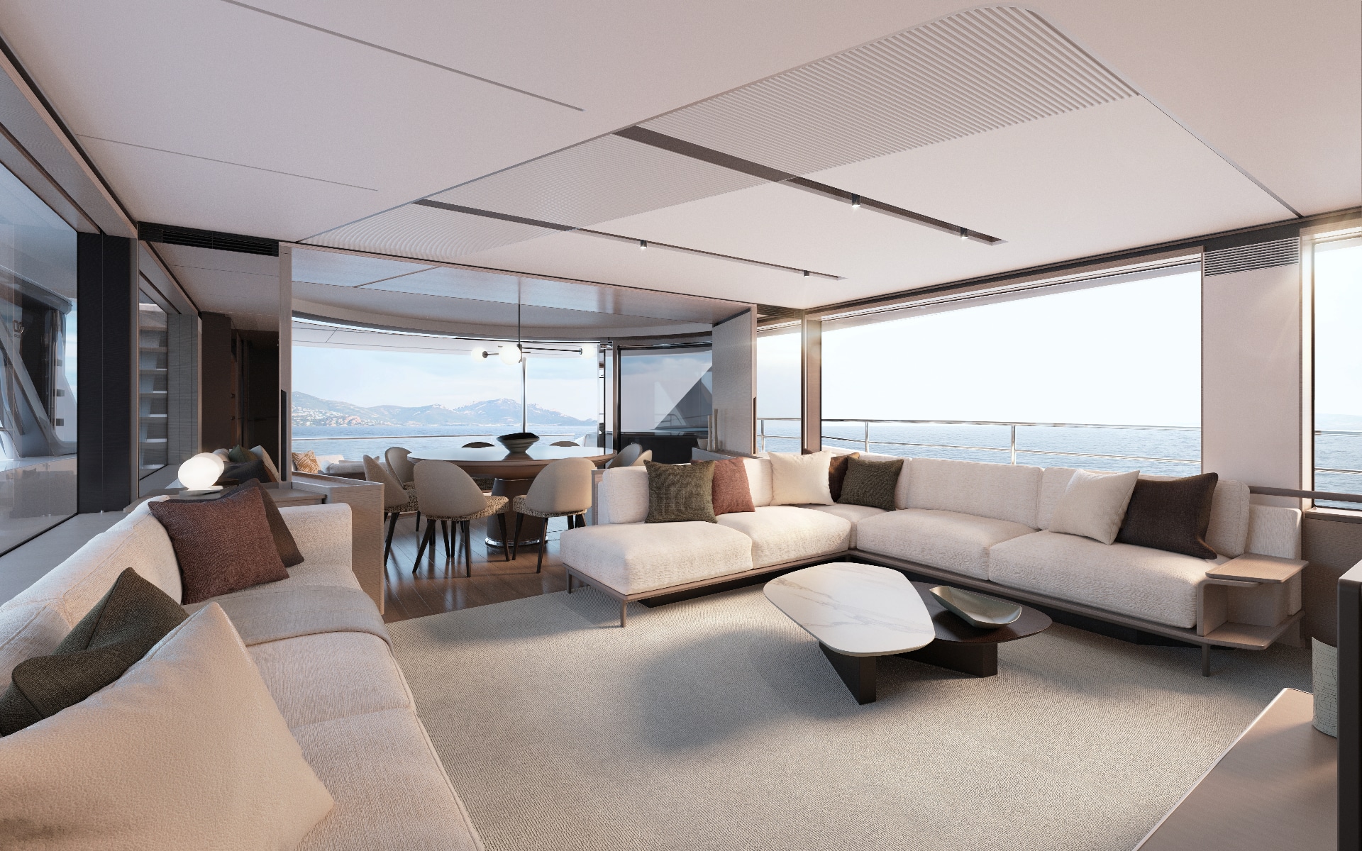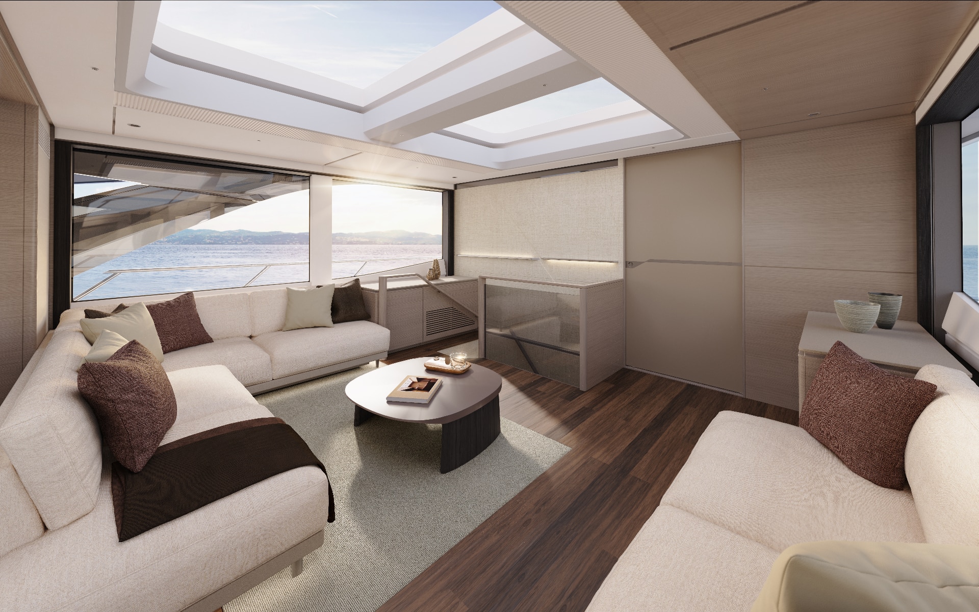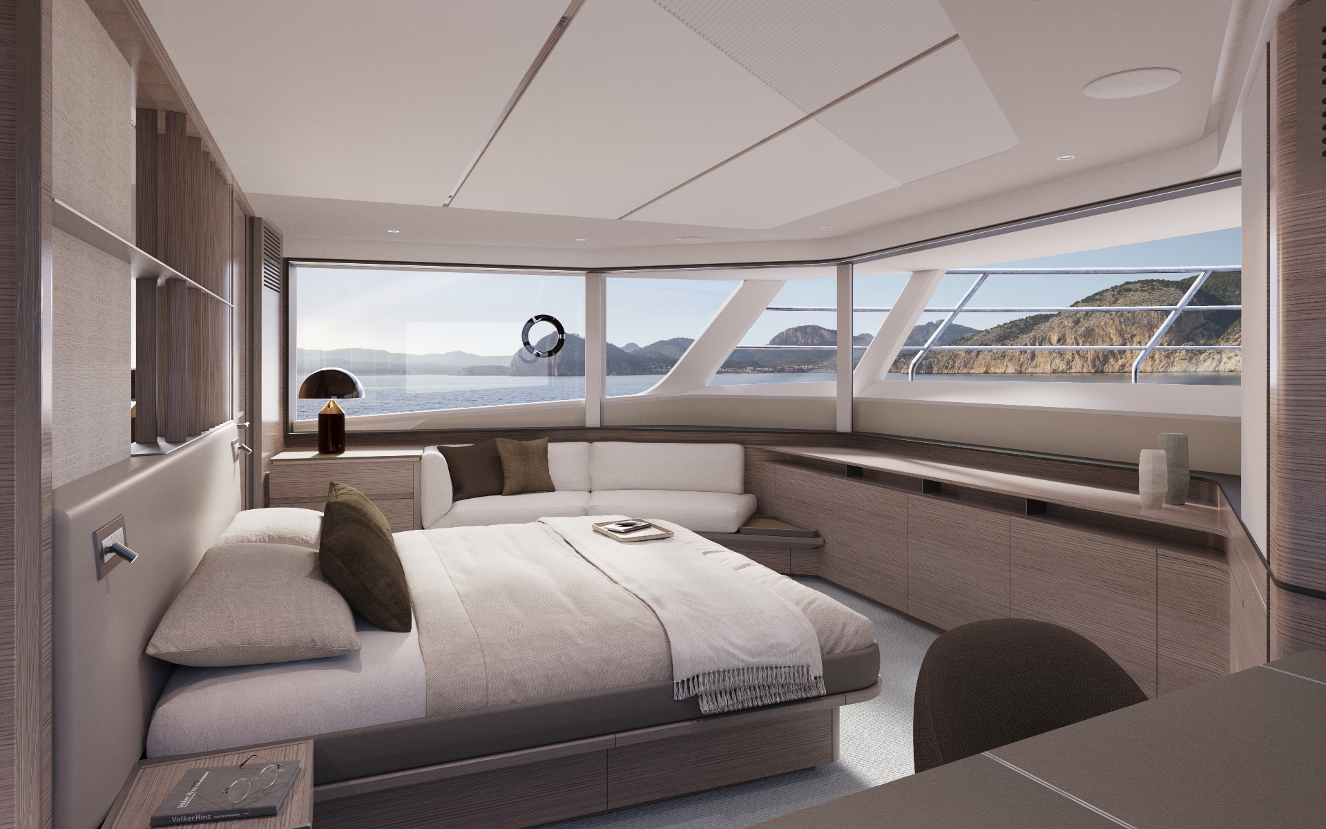 The owner’s suite positioned forward of the main deck, features 180o panoramic glazing that offers breathtaking views. For added exclusivity, an optional gullwing door provides direct access to the ‘Owner’s Foredeck Terrace,’ an ideal enclave for enjoying a peaceful morning coffee.