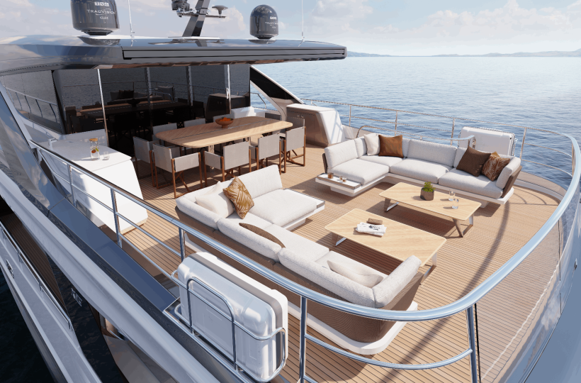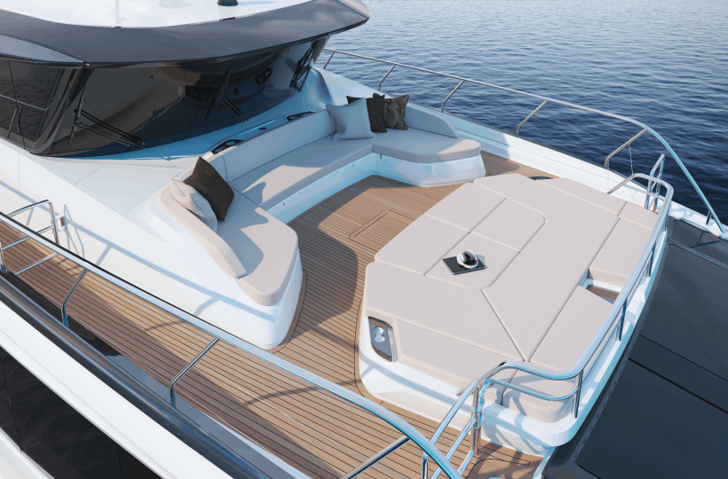 Moving aft, the Skylounge canopy provides shaded comfort over the dining area, perfect for those looking to stay cool while enjoying the sea views from this sensational deck. Beyond the dining space, the aft deck offers a variety of customizable layout options, including a spa bath, an optional bar, or the flexibility to leave the area open for loose furniture. There’s also the option to add a crane for tender storage, maximizing the deck’s functionality. The flybridge foredeck enhances the entertaining options further, with forward and aft-facing seating areas around a coffee table, which can easily be converted into sun loungers by flipping the backrests.