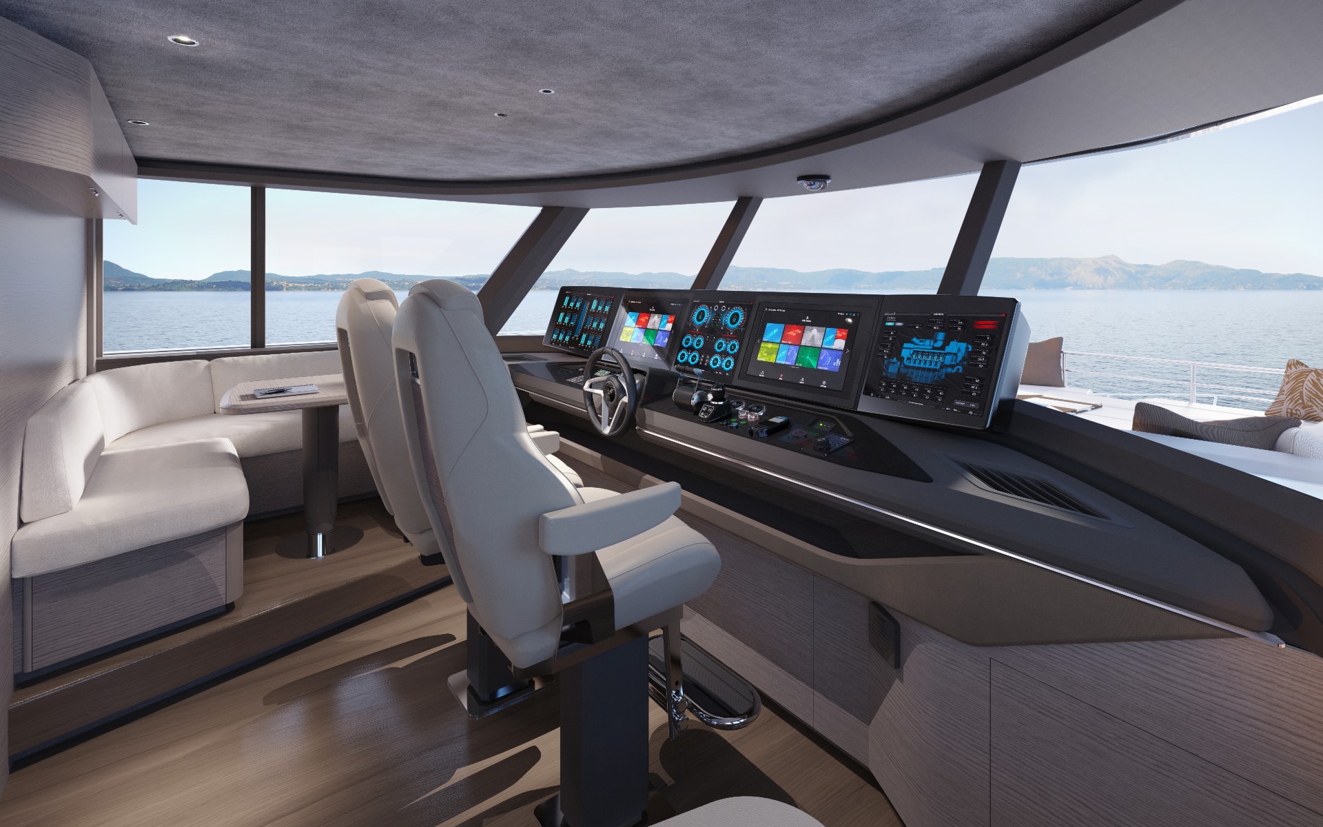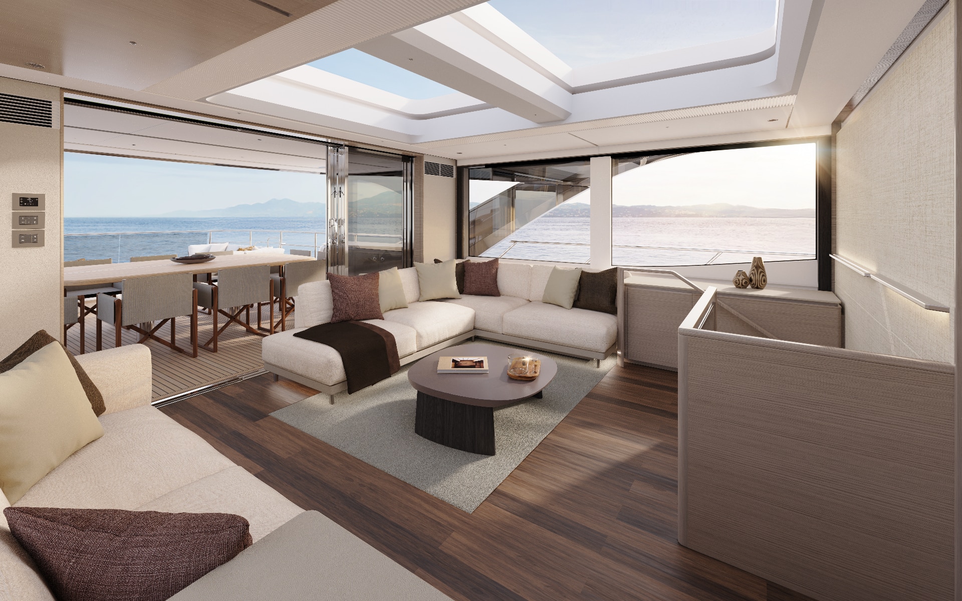 A notable first for Princess, the X90 features stunning curved patio doors that seamlessly connect the cockpit with the main deck saloon. When opened, these doors create a fluid transition, effectively extending the 10-seat dining table, located aft of the saloon, into the cockpit, offering remarkable versatility for dining and entertaining. Even when closed, the elegant curve of the glass enhances the connection to the outdoors, providing unobstructed views that beautifully emphasise the yacht’s open, spacious feel.