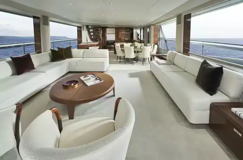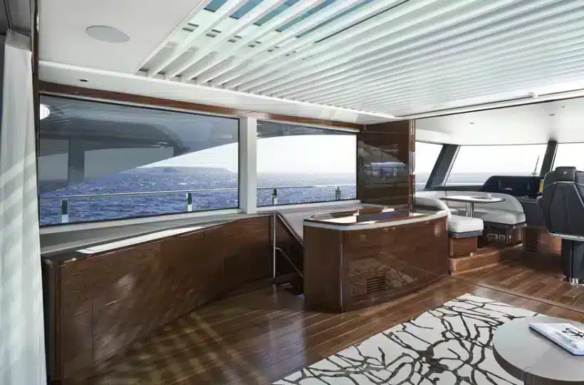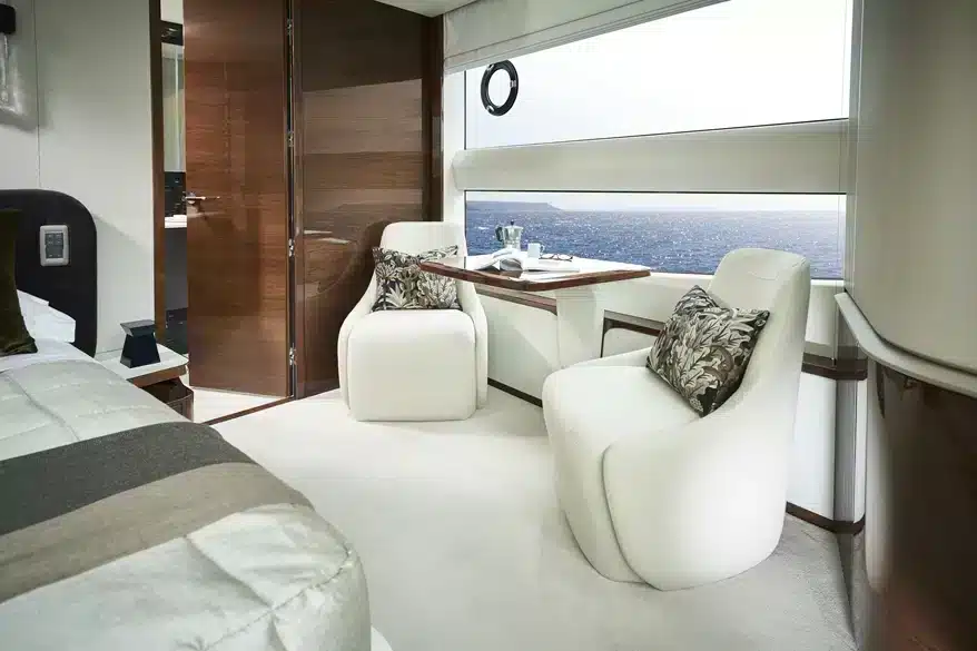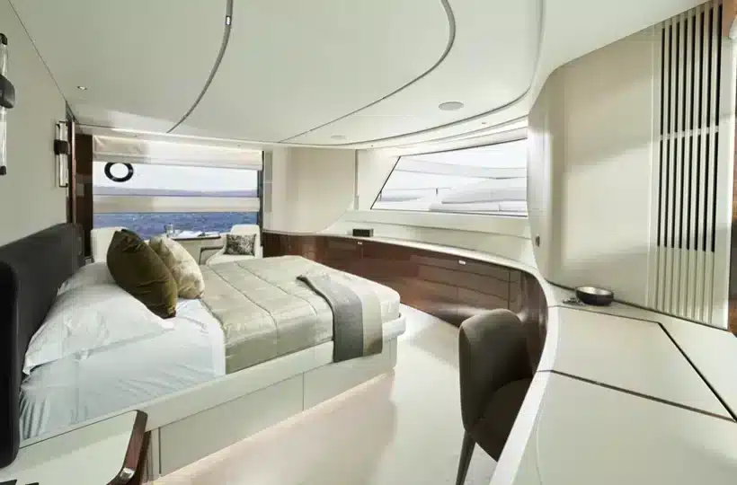 The expansive flybridge and main deck stretch across nearly the entire length of the yacht, showcasing its exquisite interior and captivating exterior that commands attention on the water. Princess Yachts, in collaboration with renowned naval architect Bernard Olensinski and esteemed Italian design firm Pininfarina, has crafted a vessel that epitomizes avant-garde yacht architecture.