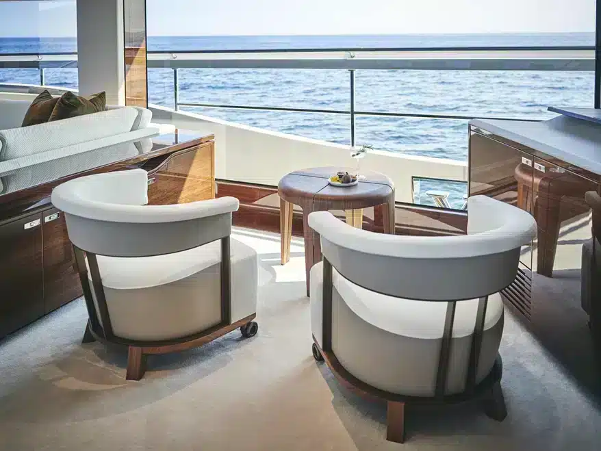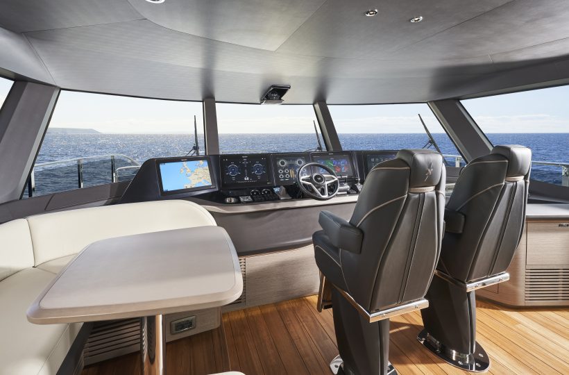 The essence of the ‘Super Flybridge’ concept permeates the interior design, creating a seamless flow from the open main deck, ideal for socializing and enjoying unobstructed views, to the lower deck, which houses three guest rooms accommodating up to six guests. At the heart of the lower deck, the full-beam master stateroom boasts a private en-suite, exuding luxury and comfort. Supporting life onboard, the generous crew quarters feature a fully-equipped crew mess, bathroom, and accommodations for up to four crew members, ensuring seamless service and relaxation for all aboard.