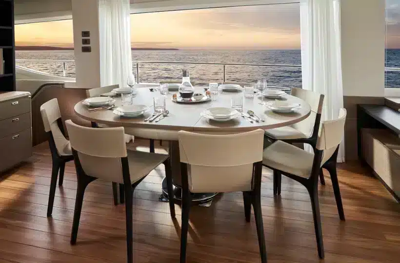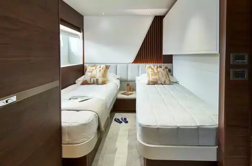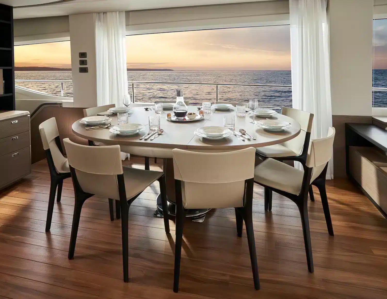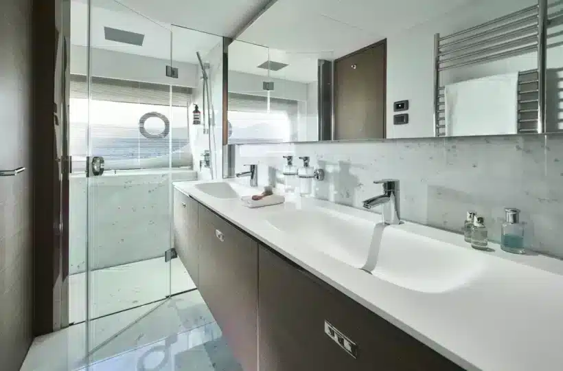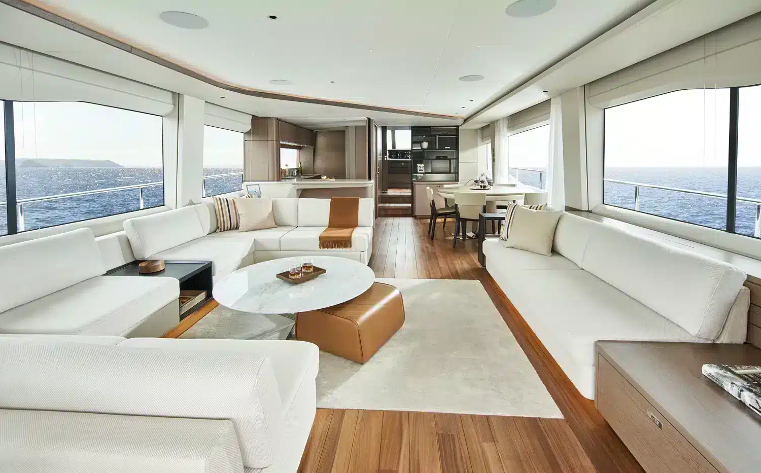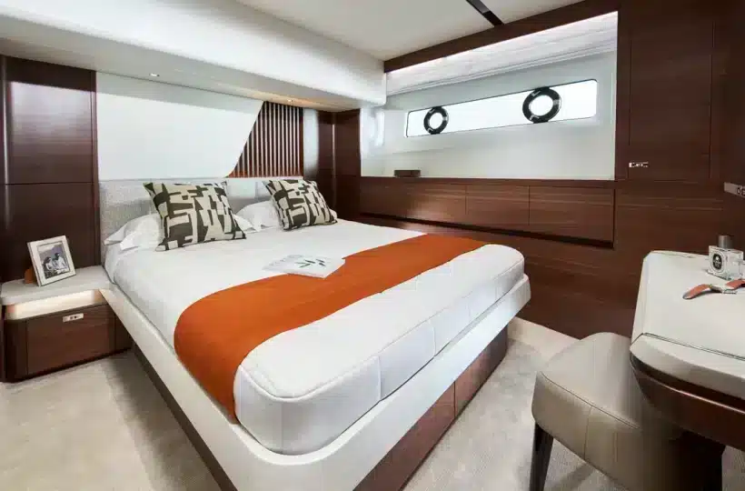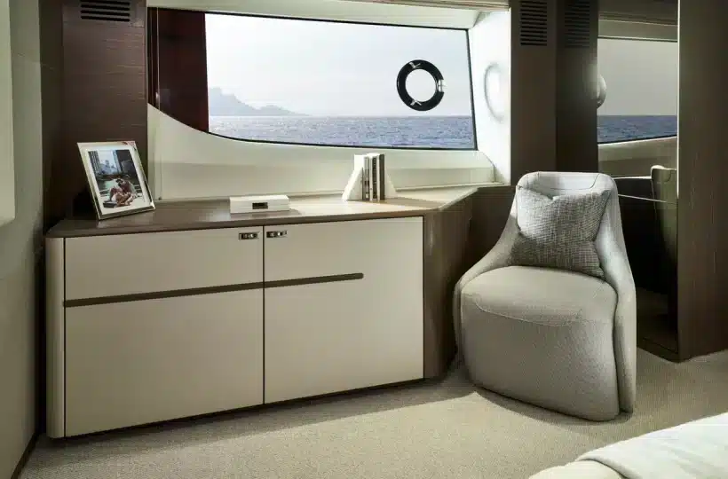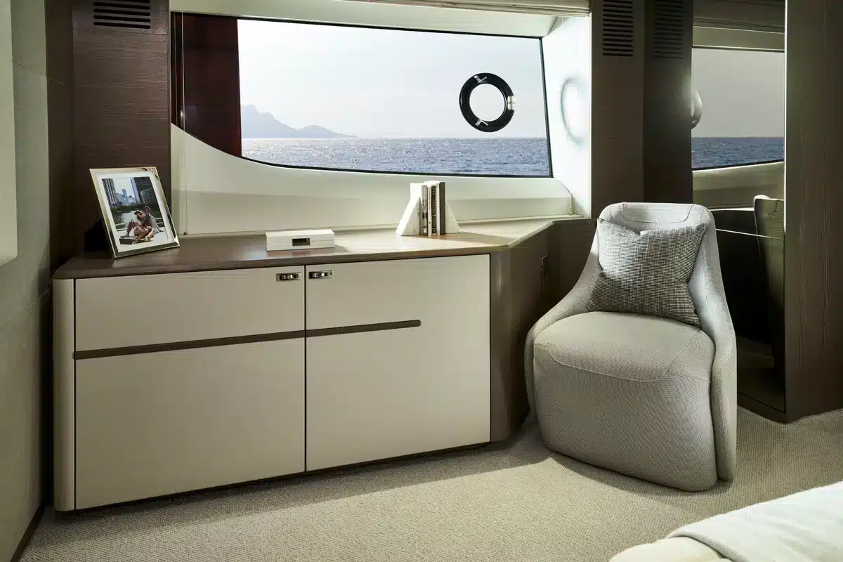 Her single-level main deck offers expansive undisturbed views, opening you and your guests to the world surrounding you. The journey through the main deck can be personalised to suit your needs, with a sliding door to the galley and an elegant electronic divider over the bar that transforms the space from open and sociable to intimate and closed. Below deck, four ensuite cabins can sleep up to 8 guests supported by class-leading separate crew quarters, with two crew cabins and a crew mess. The superior master cabin makes full use of the Princess Y85’s full width with natural light flooding the room and a large ensuite bathroom attached. Throughout the yacht, technology is state-of-the-art with Naim audio system featuring as standard throughout the cabin and main deck spaces.