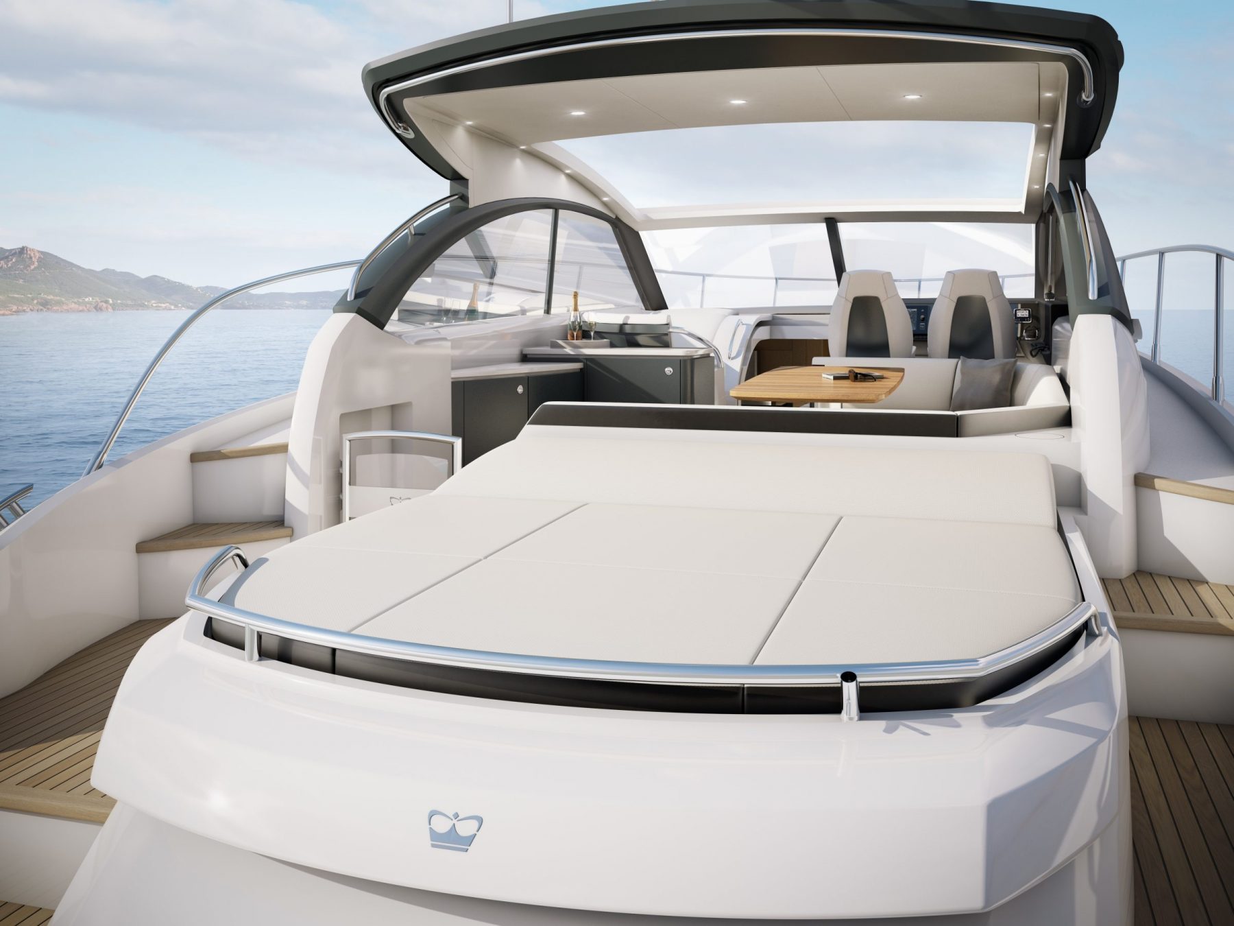 The V48 Open, which made her international debut in September at the Festival de la Plaisance de Cannes, personifies hardtop sportscruiser cool, with its spacious open cockpit and vast electrically operated sunroof. Generous seating around a teak table and further seating forward, adjacent to the sculpted twin helm seats, create the perfect space to enjoy life on deck and when cruising at speed. Aft of the cockpit is a large sunbed positioned above the tender garage which can accommodate a 3.25m jet RIB. Below decks, the V48 Open provides flexible accommodation for up to 6 guests including a private lower saloon and luxurious full beam master cabin.