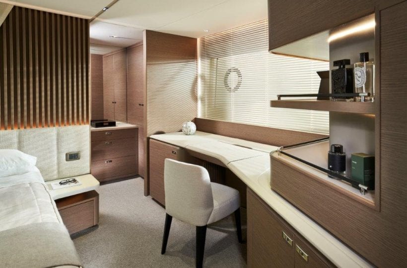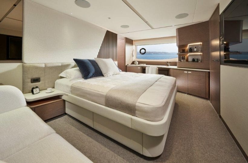 Unter Deck werden acht Gäste komfortabel in vier Kabinen untergebracht, jede mit eigenem zugänglichen Badezimmer. Die Master-Suite über die gesamte Breite nimmt einen Ehrenplatz ein und verfügt über einen eigenen privaten Zugang über eine Wendeltreppe vom Salon aus – mit reichlich Stauraum, einem großen Badezimmer en suite und einem 49-Zoll-LED-TV mit Naim-Audio kann Luxus an Bord erlebt werden. Weiter achtern befindet sich eine Crew- oder optionale Gästekabine mit zwei Einzelbetten und eigenem Badezimmer.