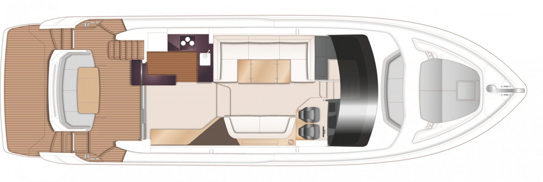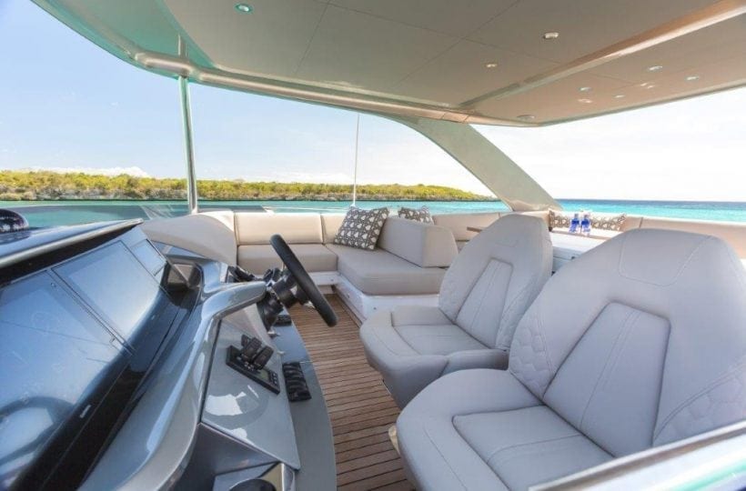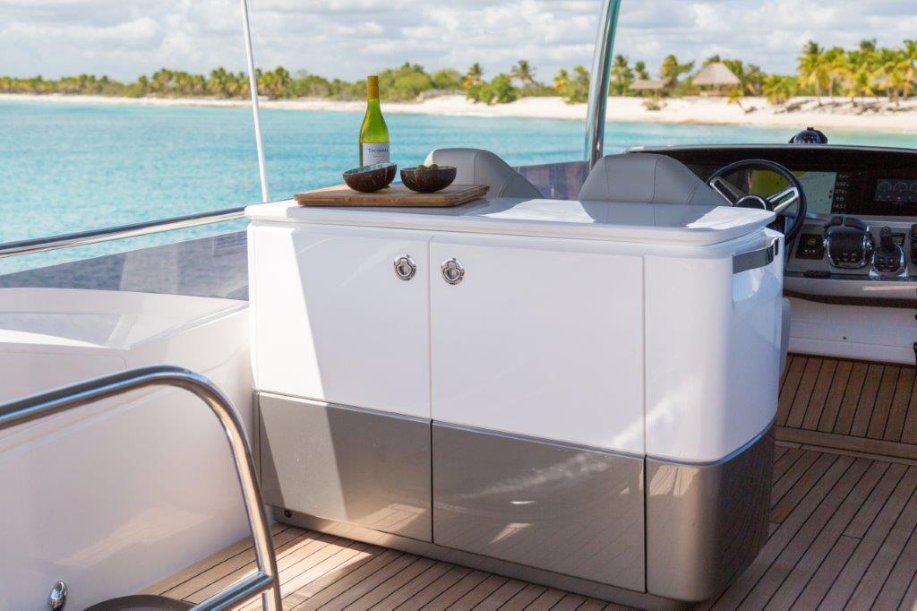 Elegant shaped surfaces and precision layered geometry define the interior to form a truly tranquil environment with meticulous attention to detail. The emphasis on comfort and expansive living areas is visible throughout the deck saloon which features the new internal console area incorporating clean, streamline surfaces and finishes.