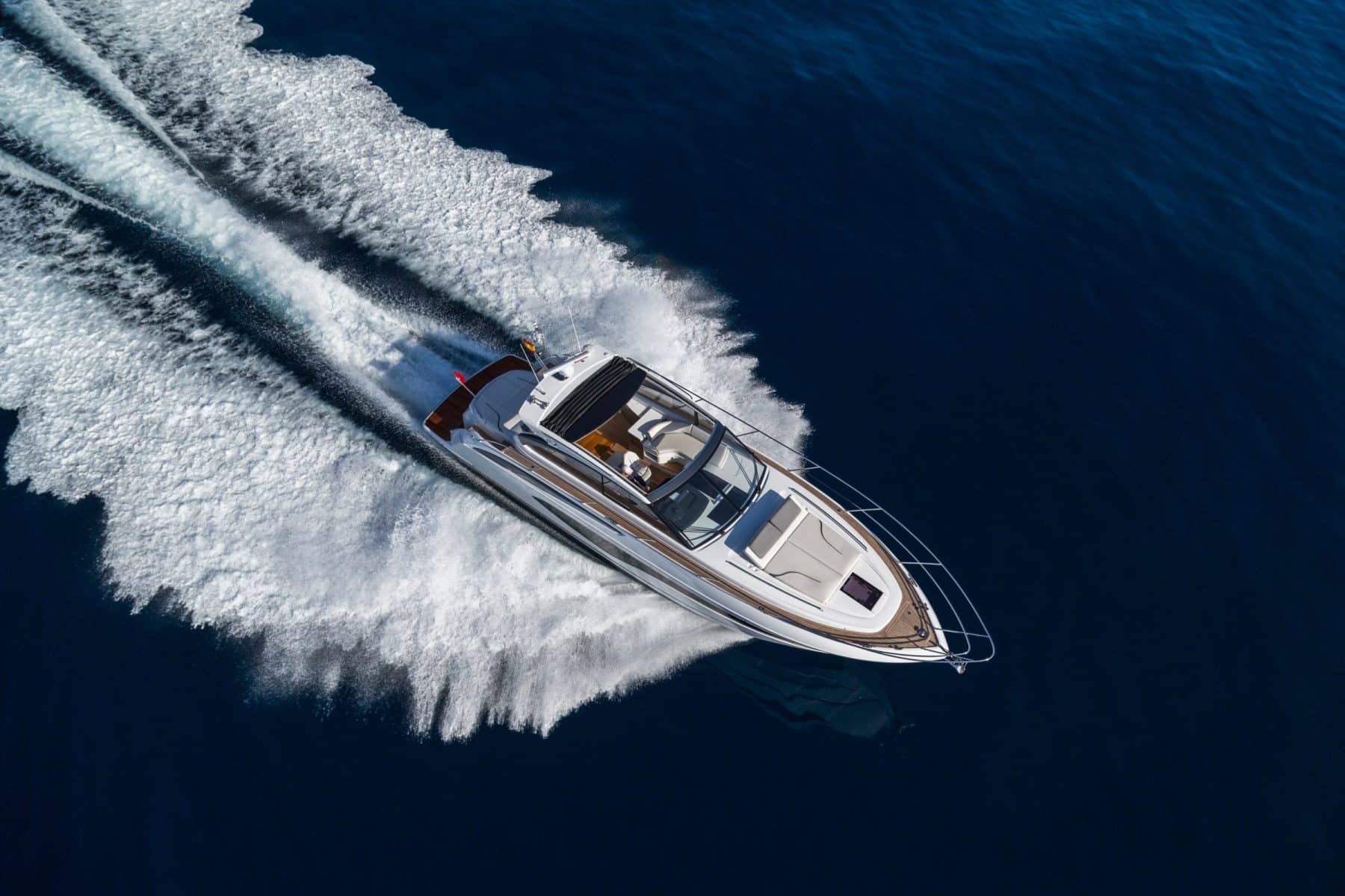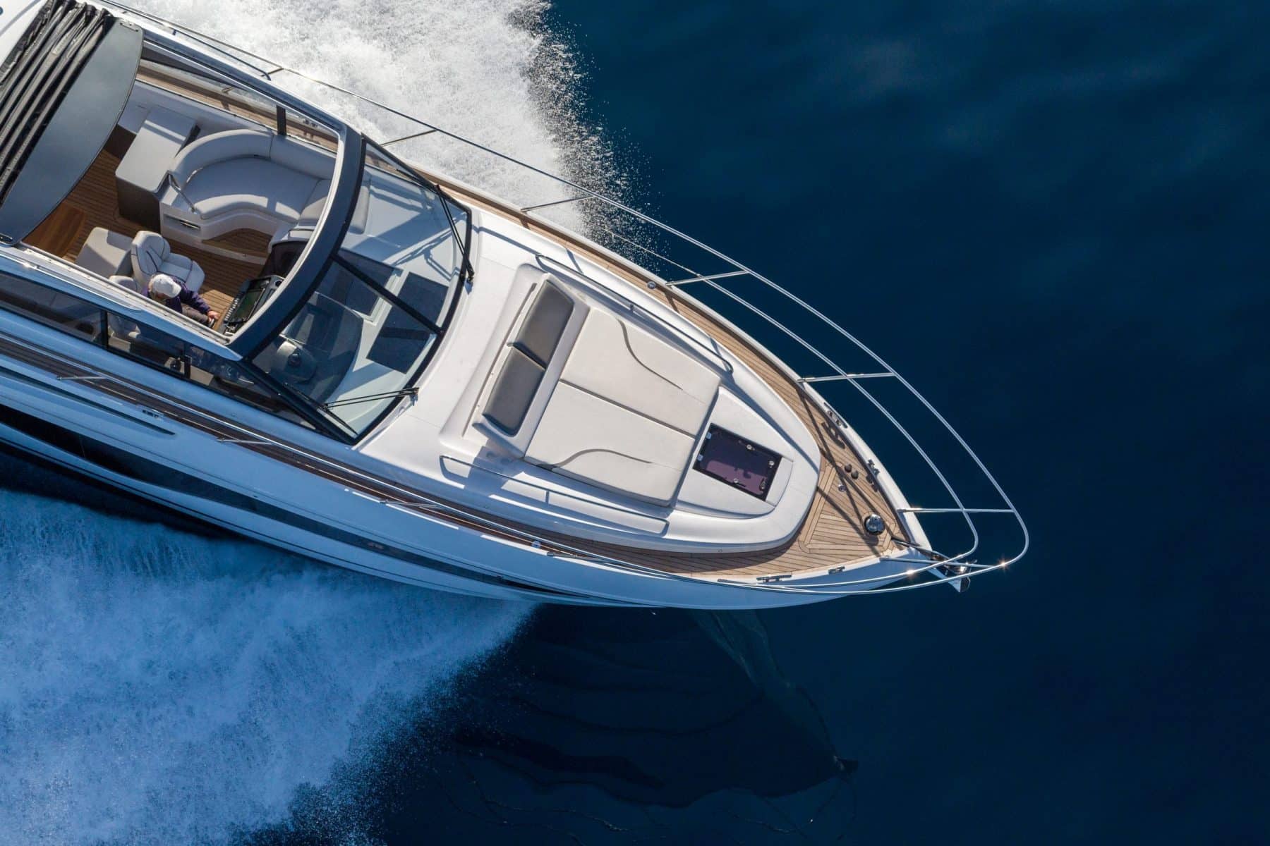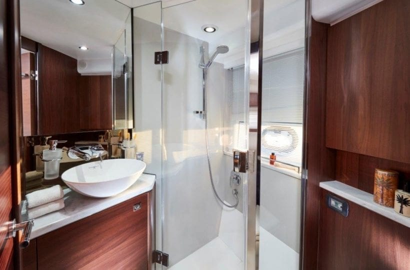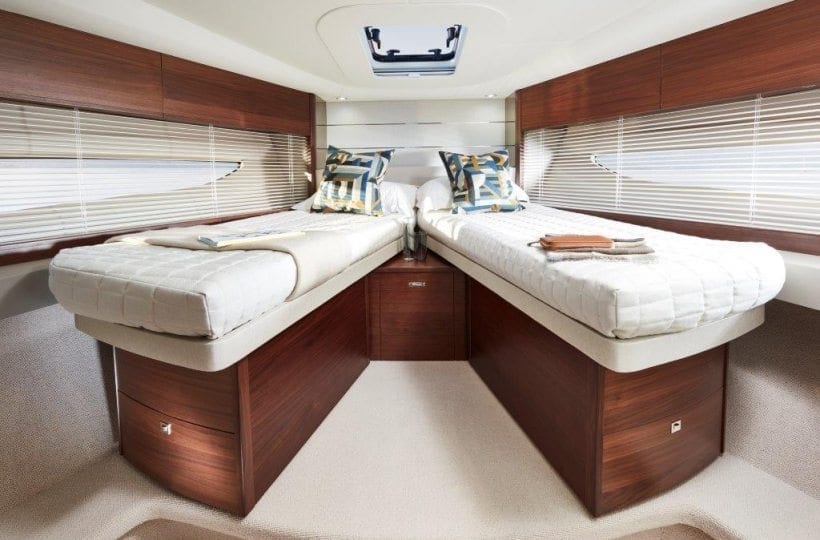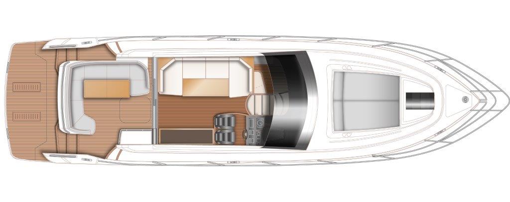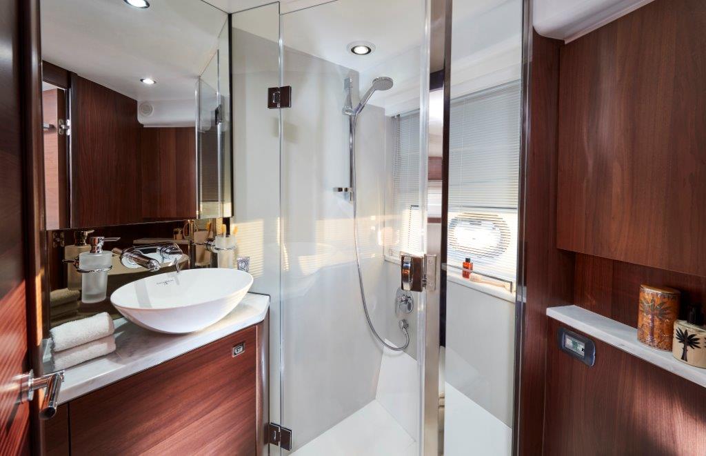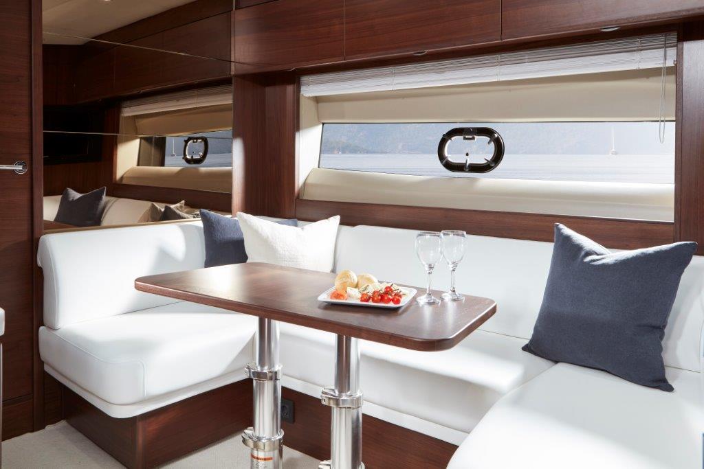 This ethos of contemporary exterior design flows through into her interior. On the deck saloon model timber flooring features throughout the main deck and galley areas and the twin helm seats in Nero black leather are a new signature across the V Class range.